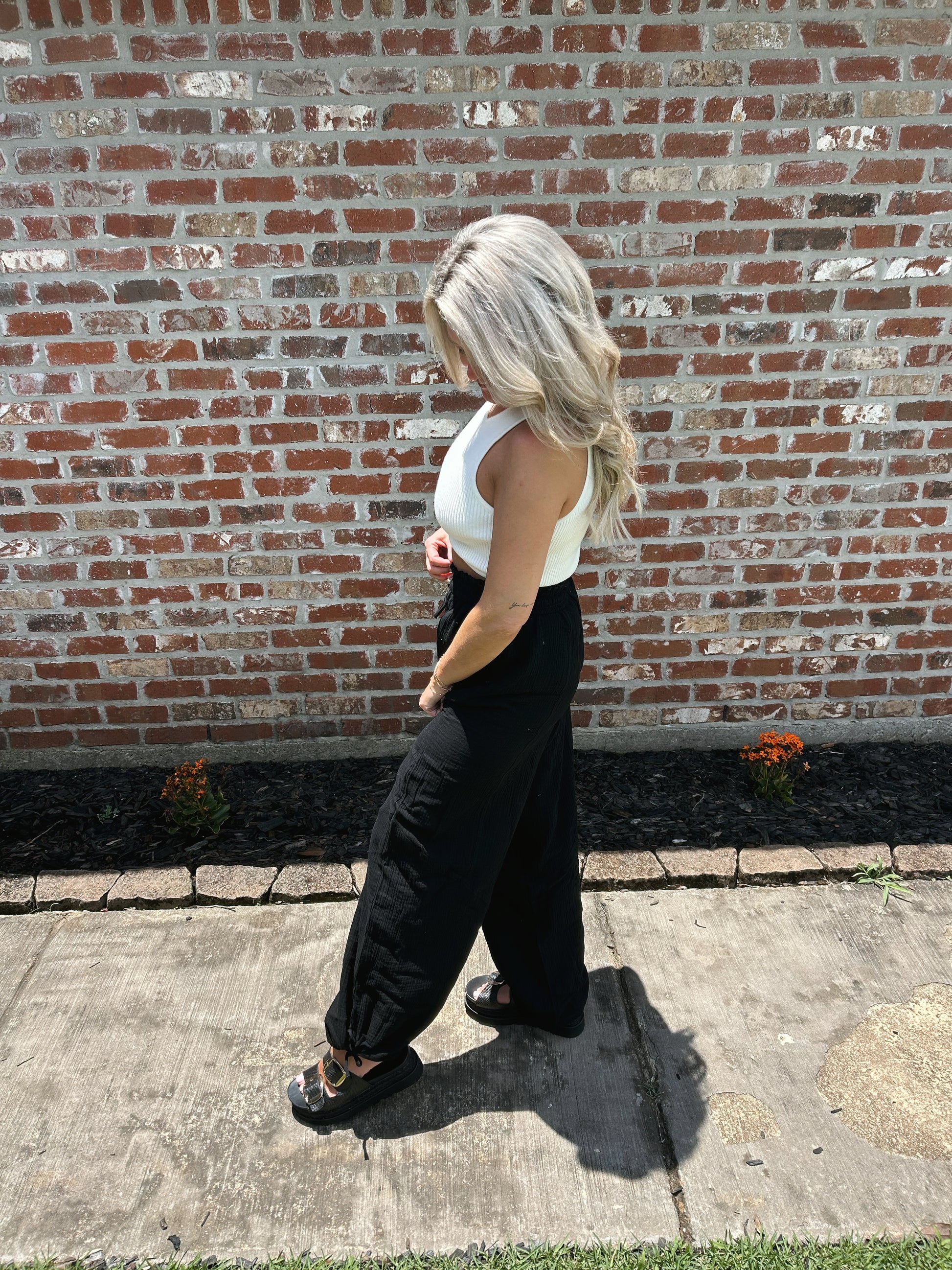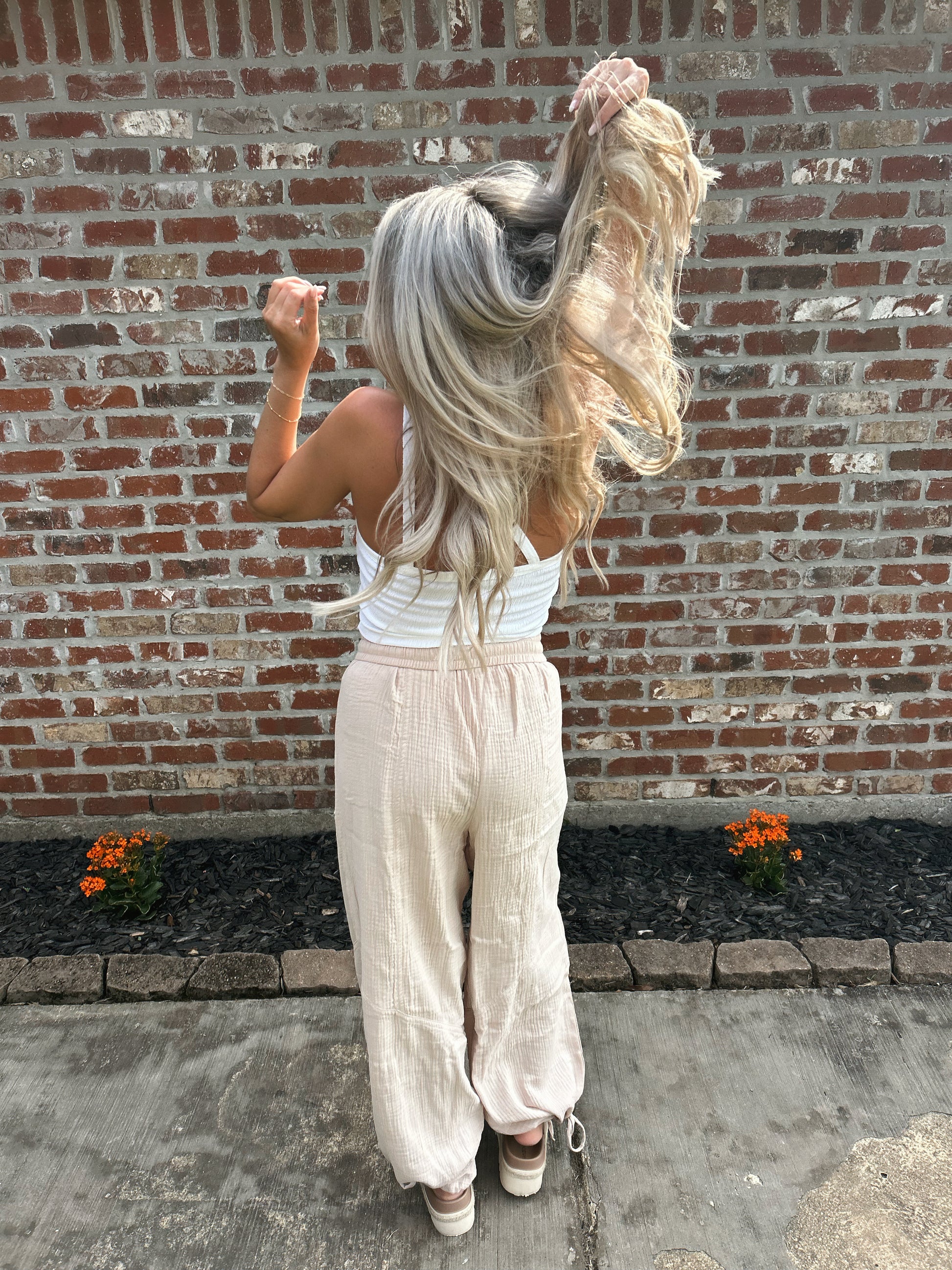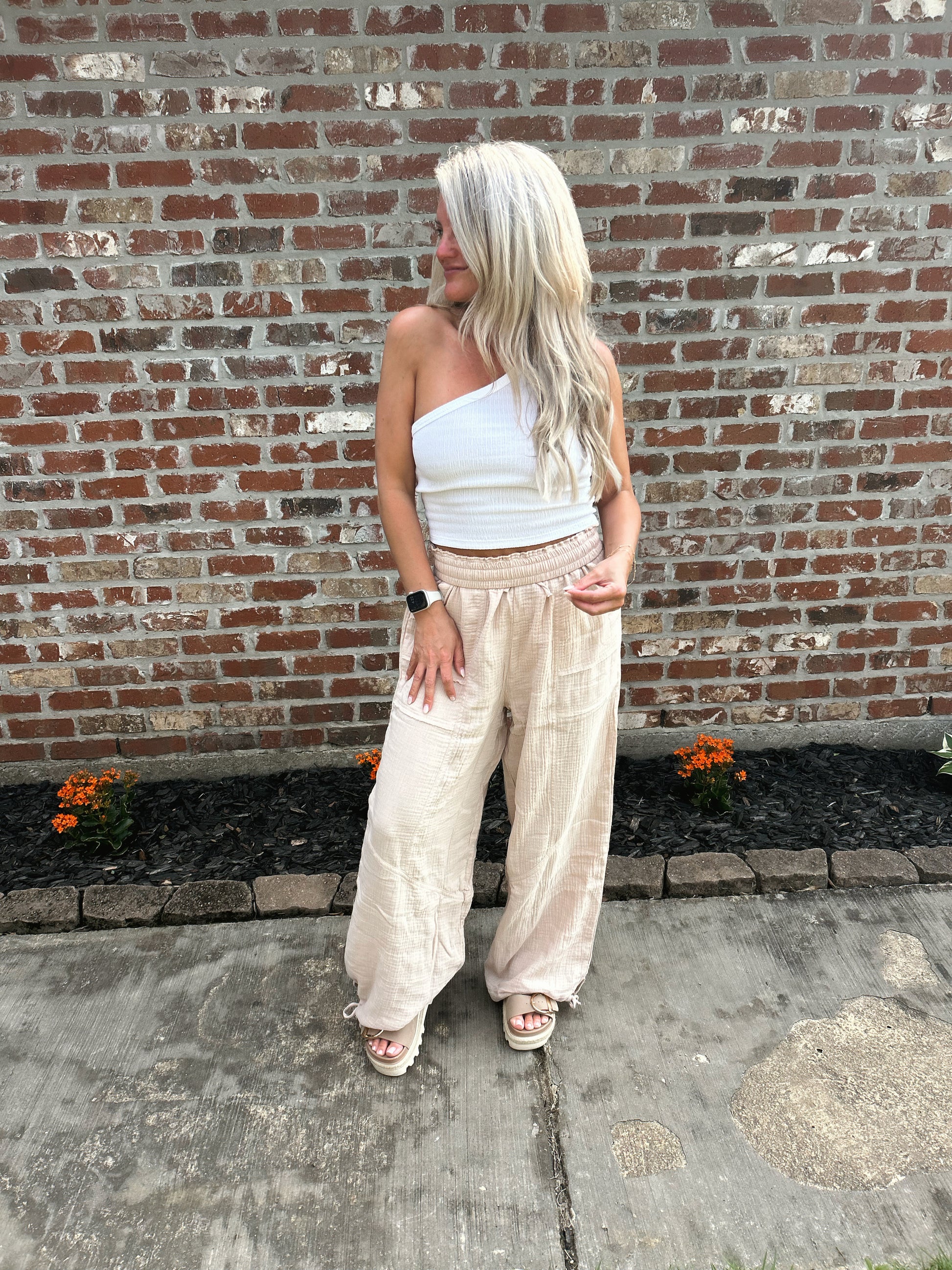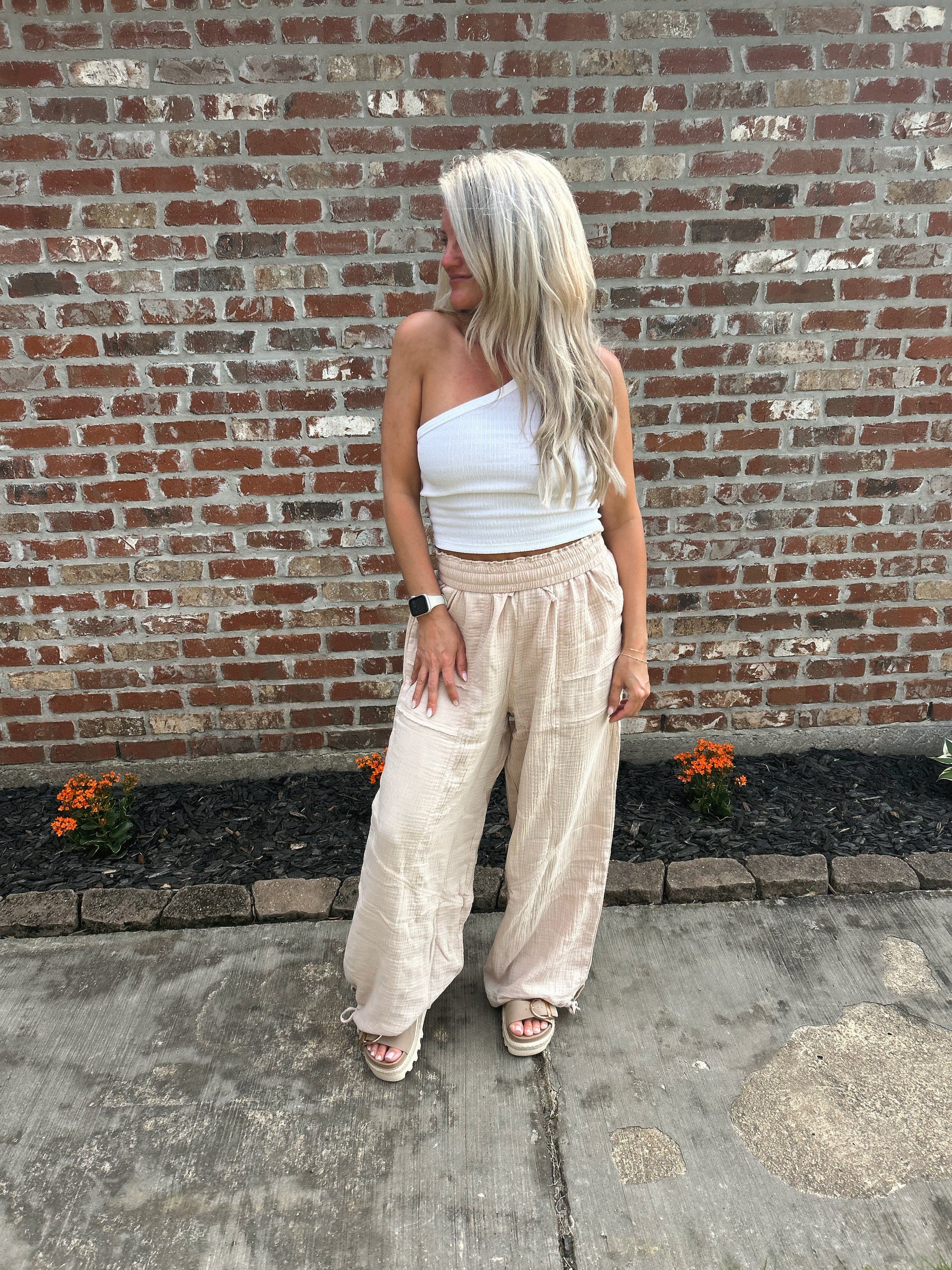 These high waisted gauze material pants are so versatile and great for spring and summer! The bottom has an adjustable tie to make them a jogger style pant or you can leave them untied and they are wide leg pants. Oversized fit