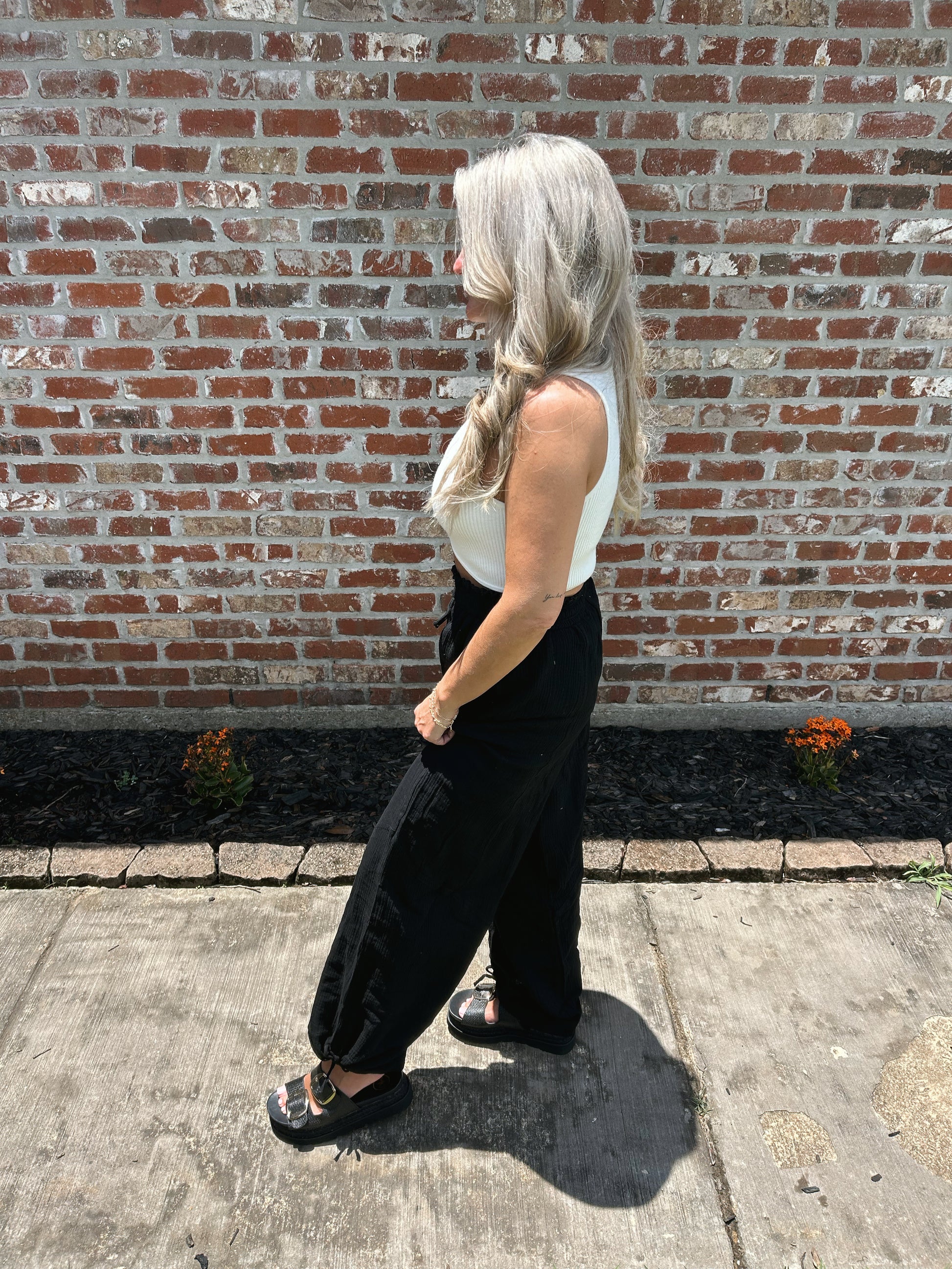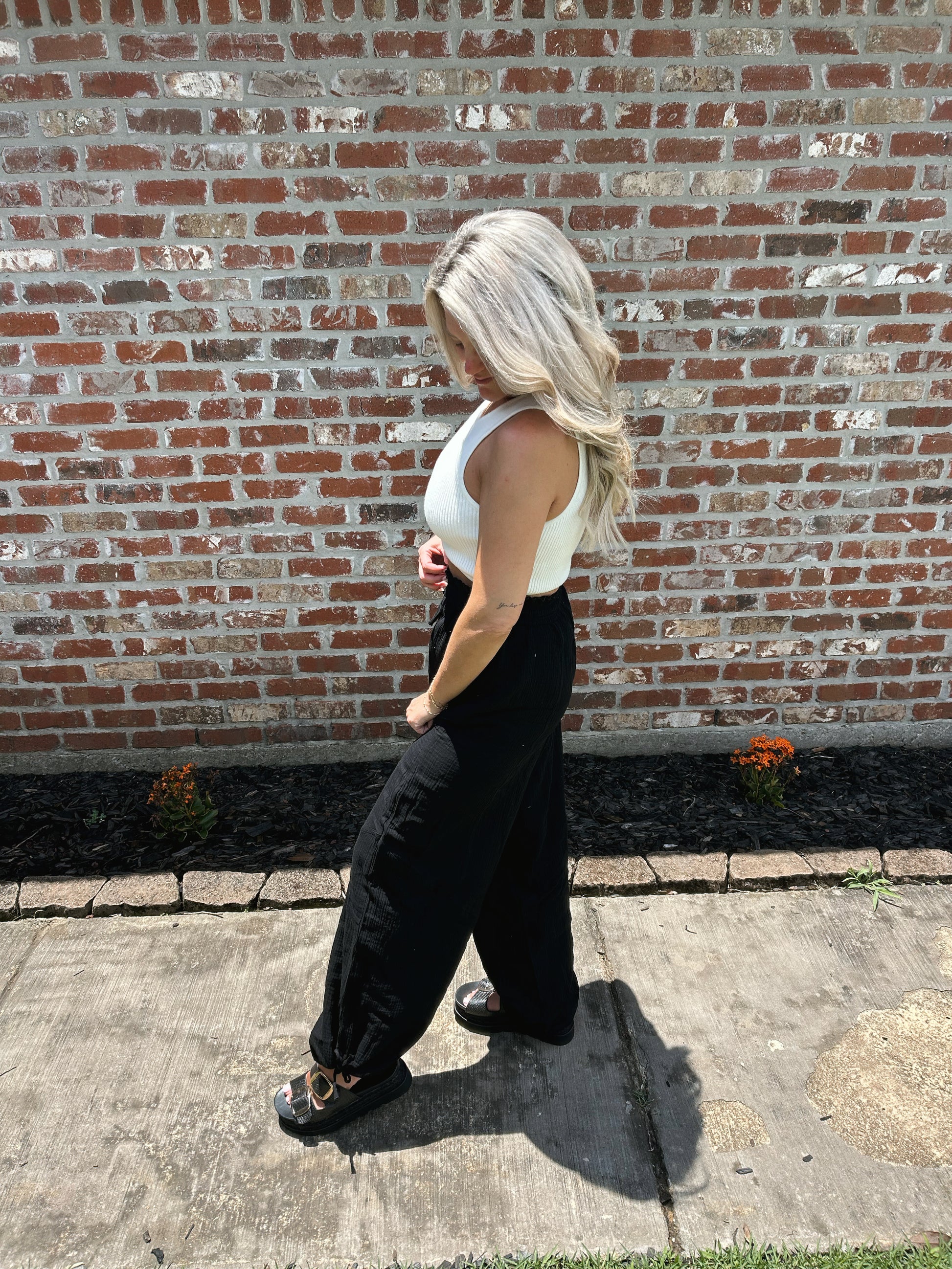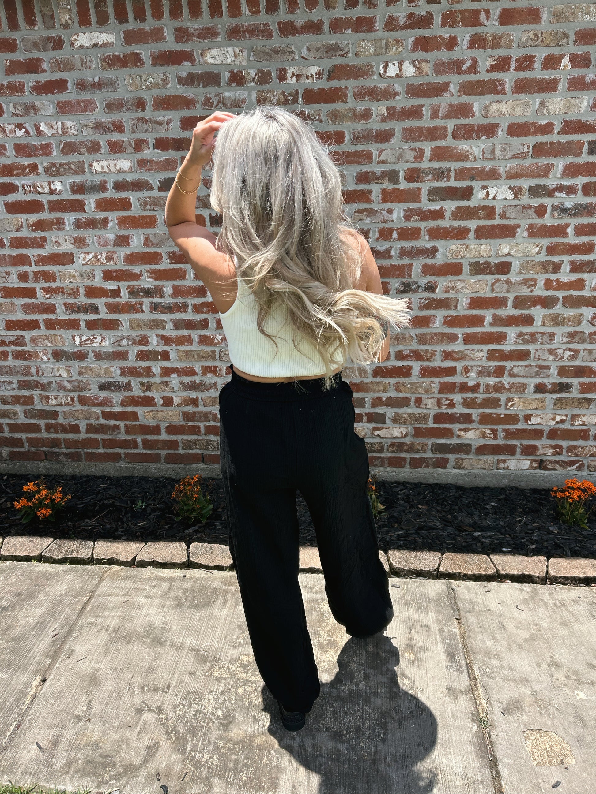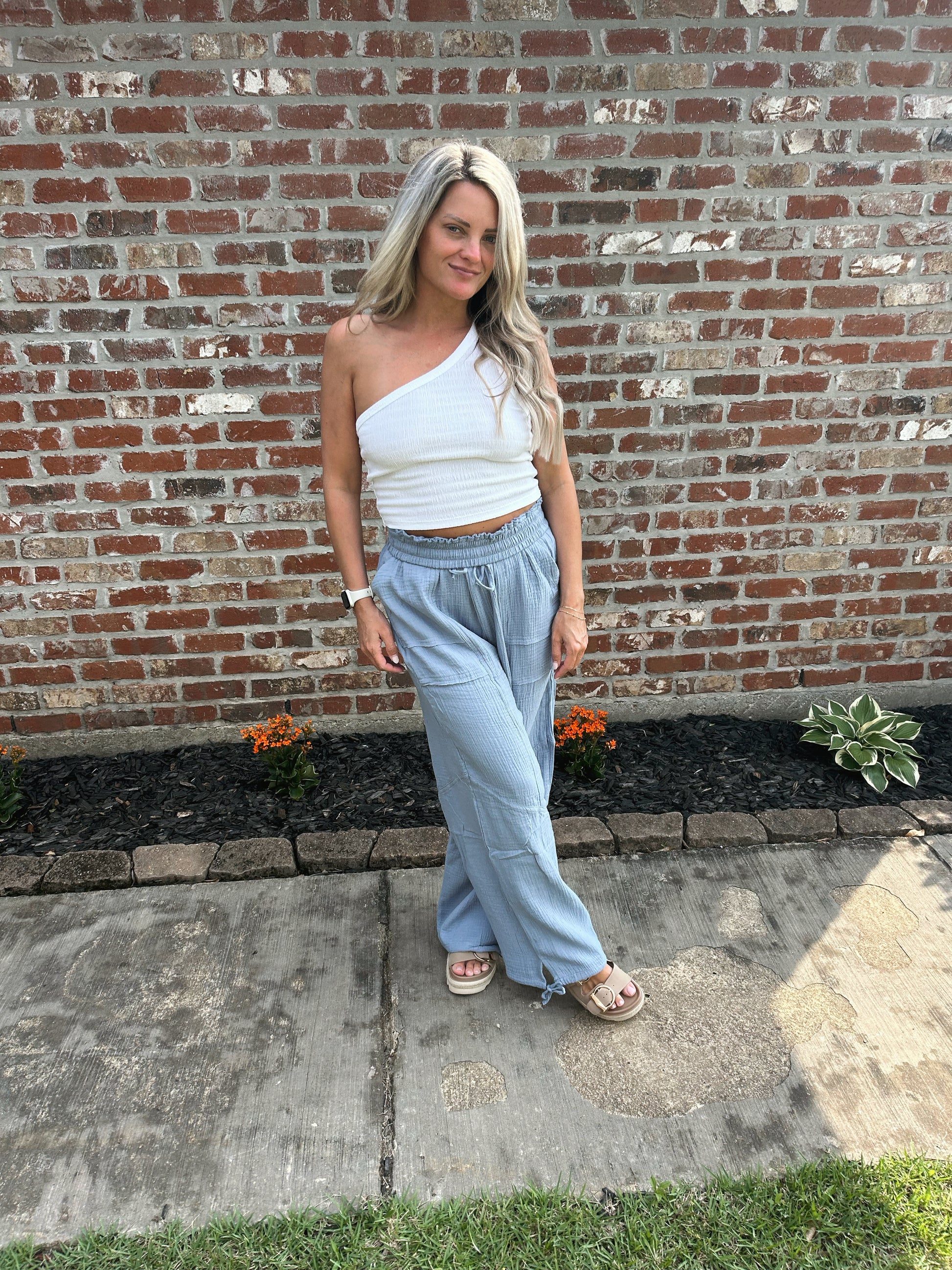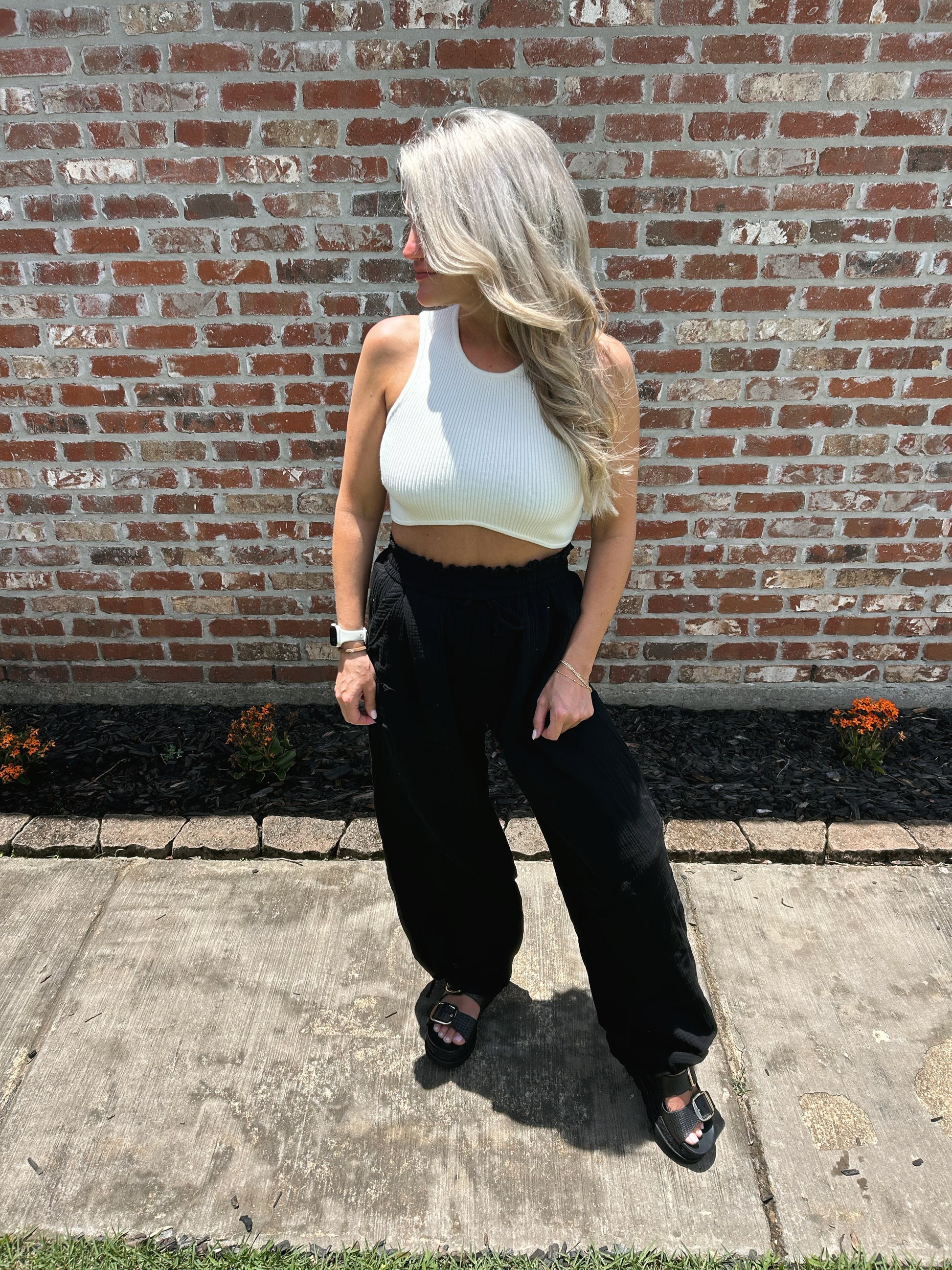 These high waisted gauze material pants are so versatile and great for spring and summer! The bottom has an adjustable tie to make them a jogger style pant or you can leave them untied and they are wide leg pants. Oversized fit
