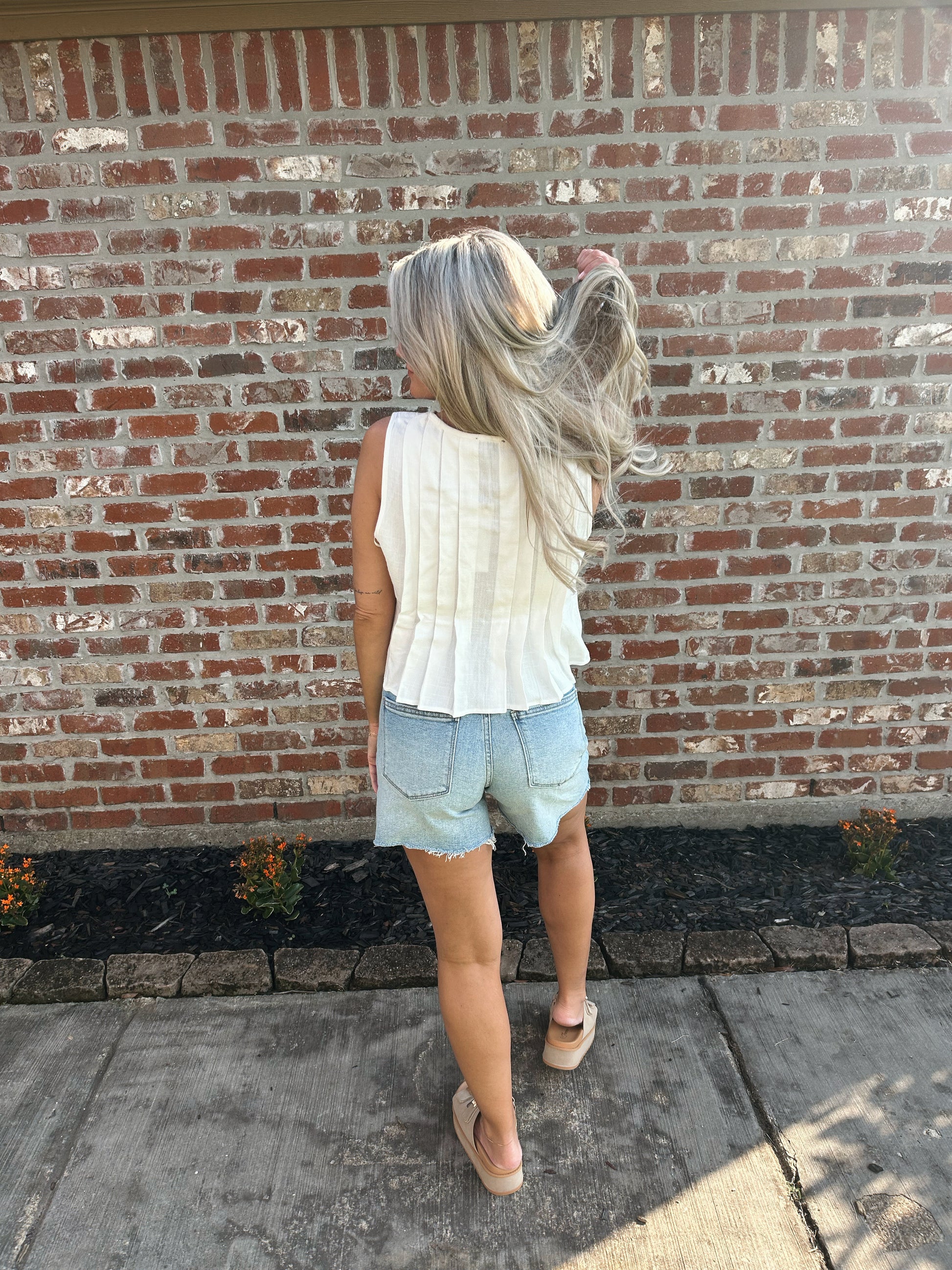 Linen blend, pleated, tie front tank. Lightweight and airy.
