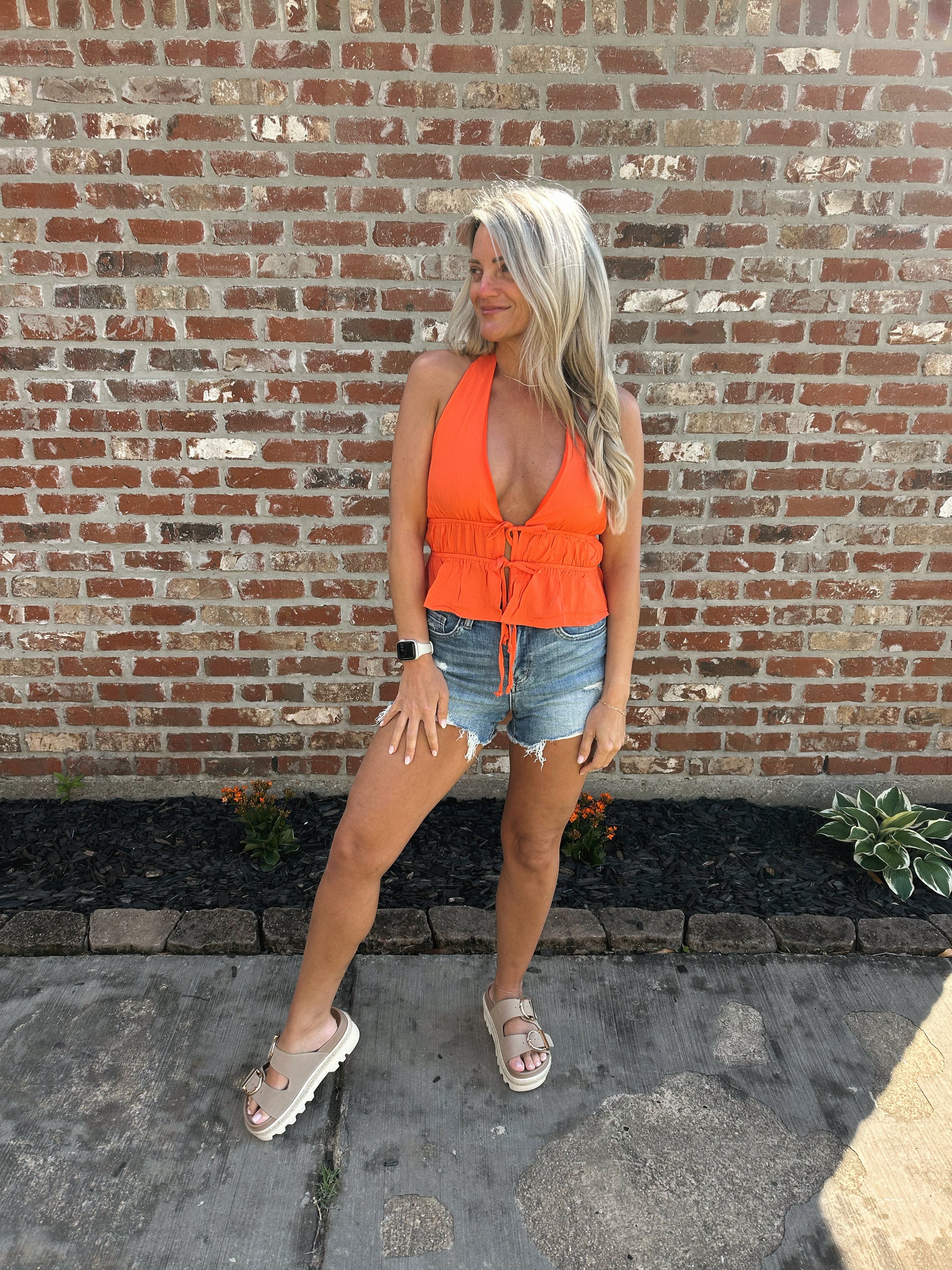 This halter top is perfection. Lightweight and soft with adjustable ties and a little ruffle bottom.