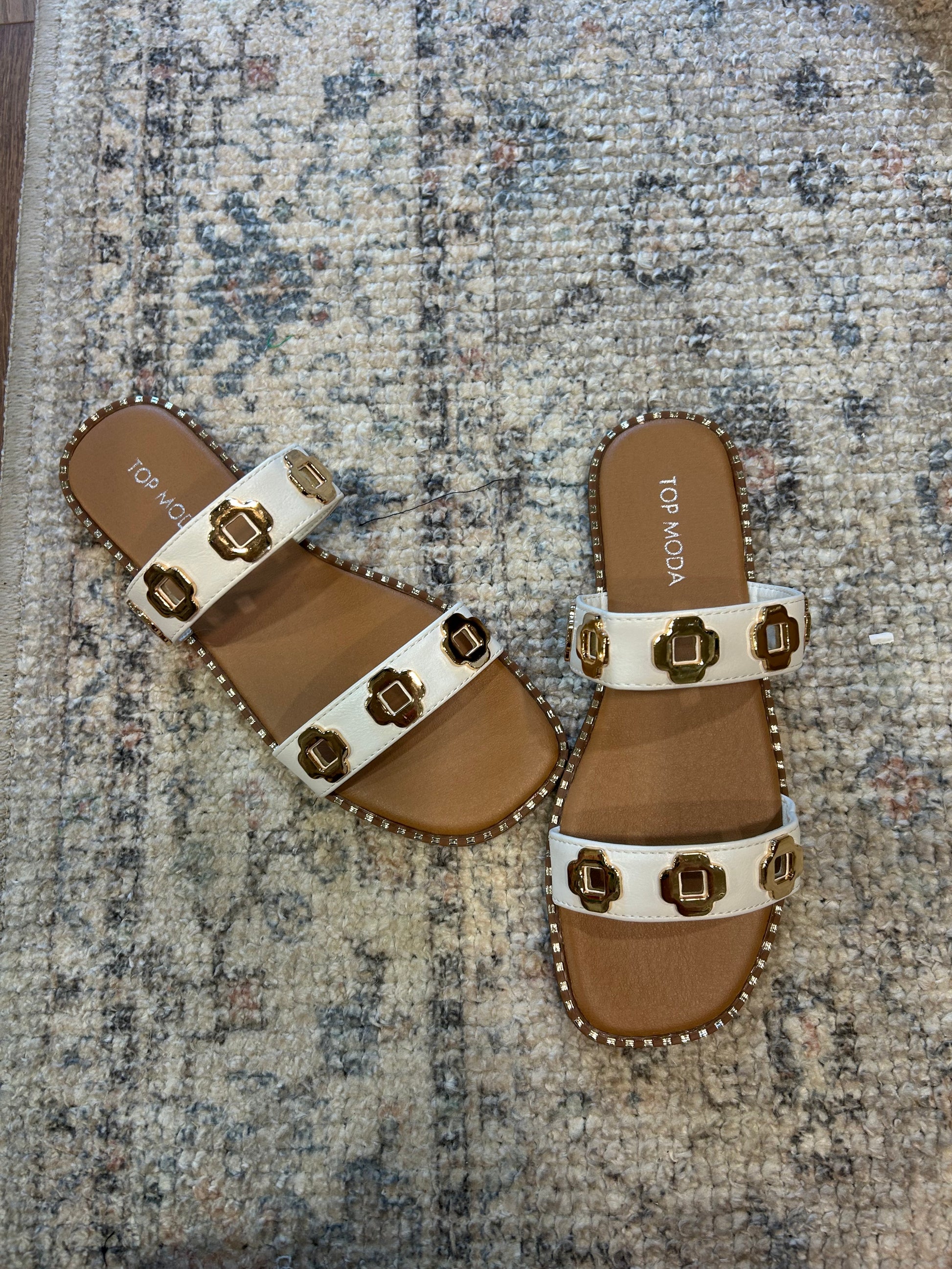 The Italy Flat Sandals are your new everyday sandals! Double straps and gold accents.