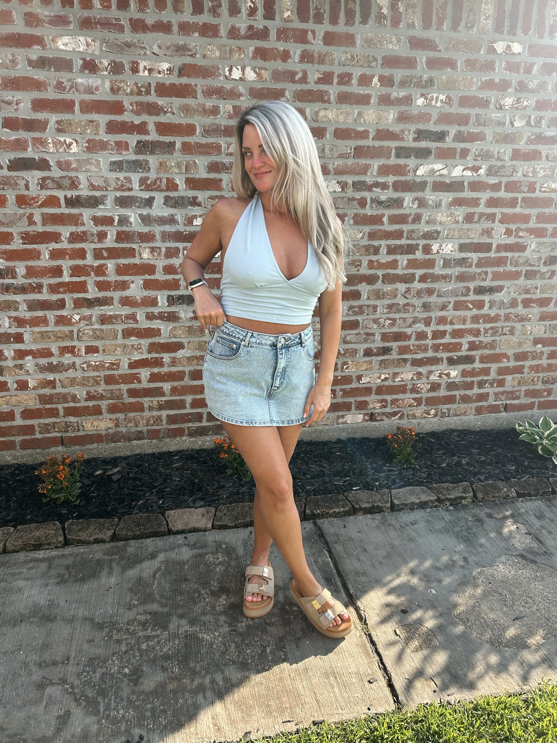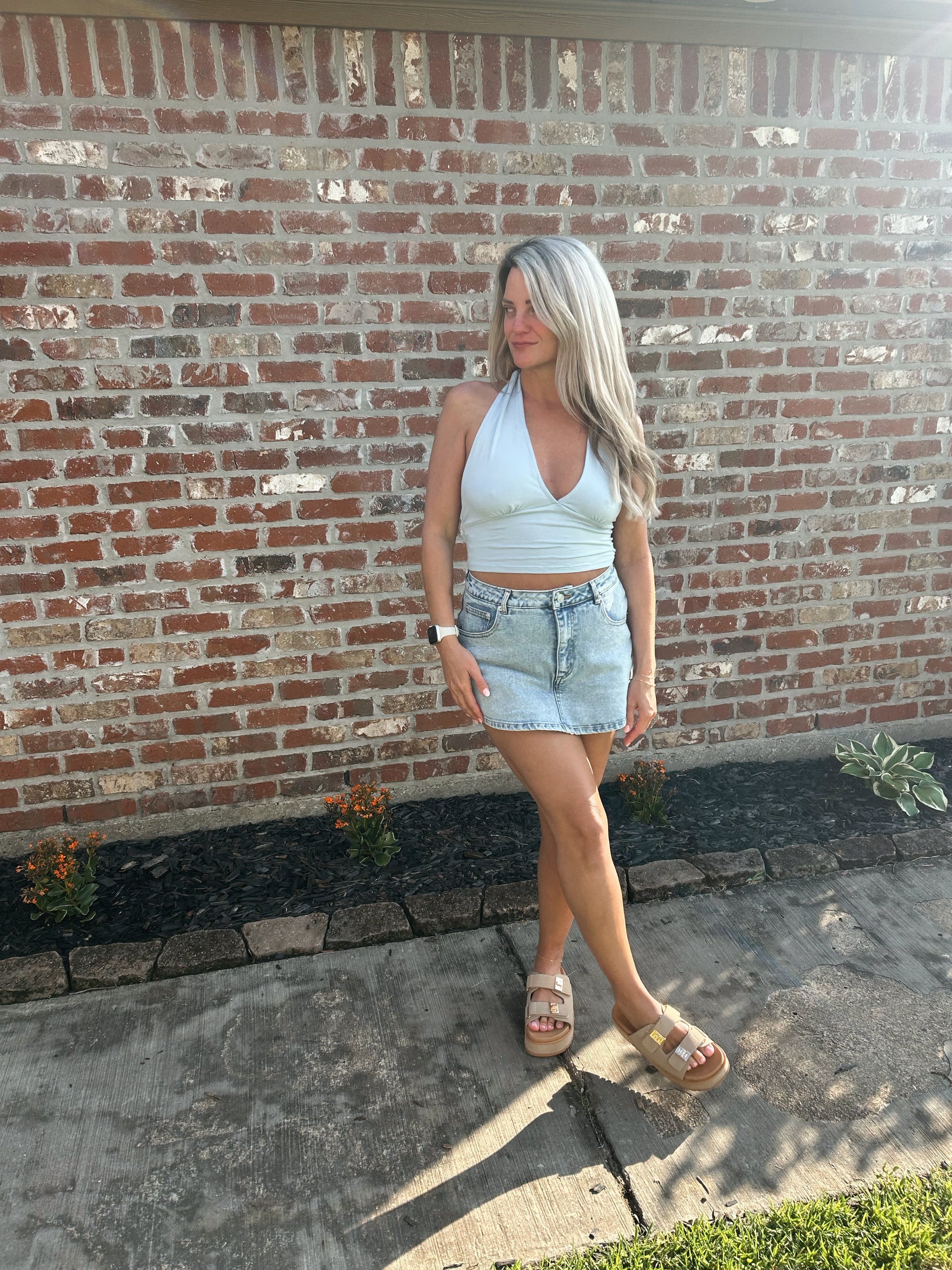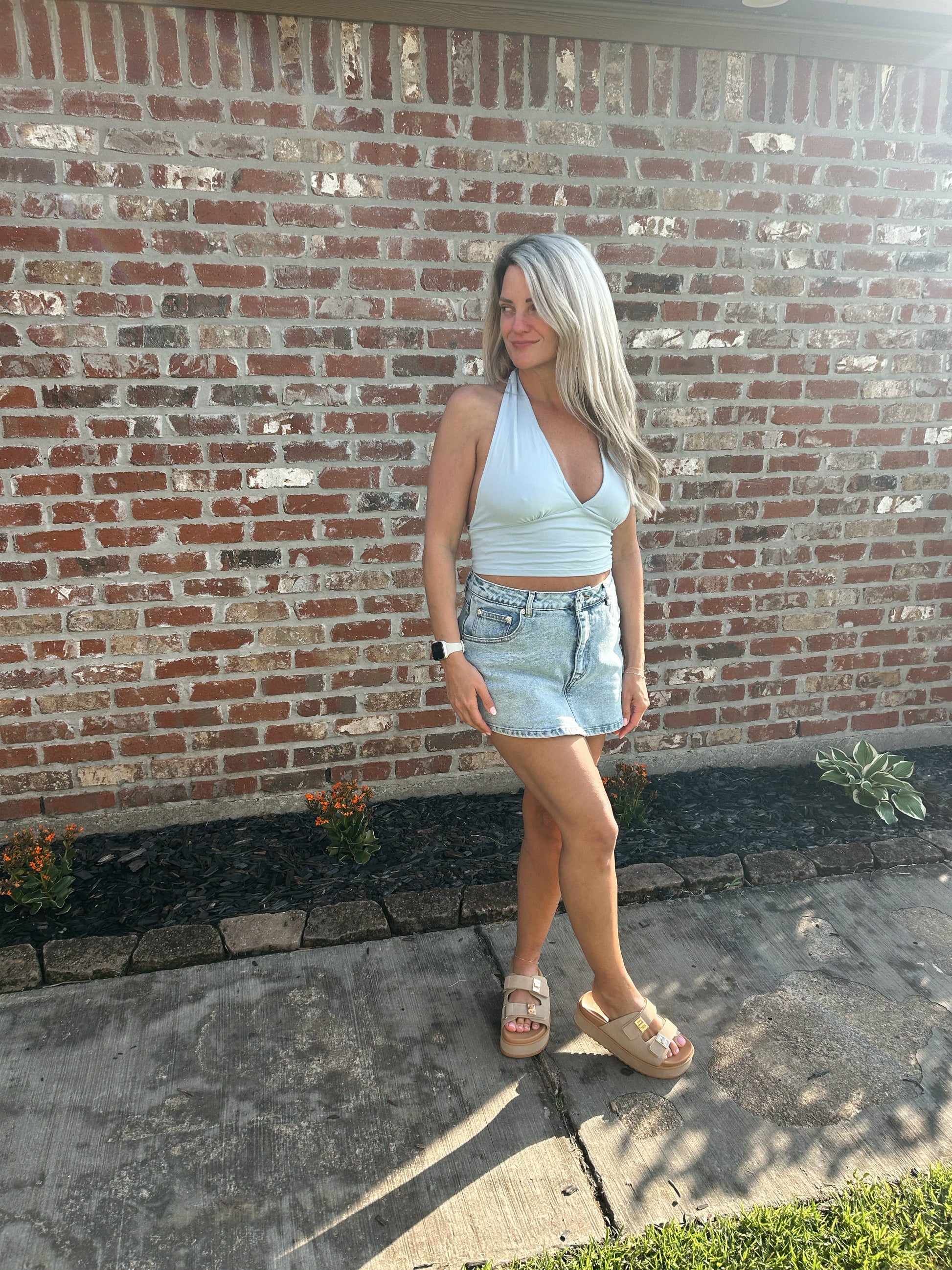 Soft brushed, baby blue cotton halter. Ties around neck and back. Open back