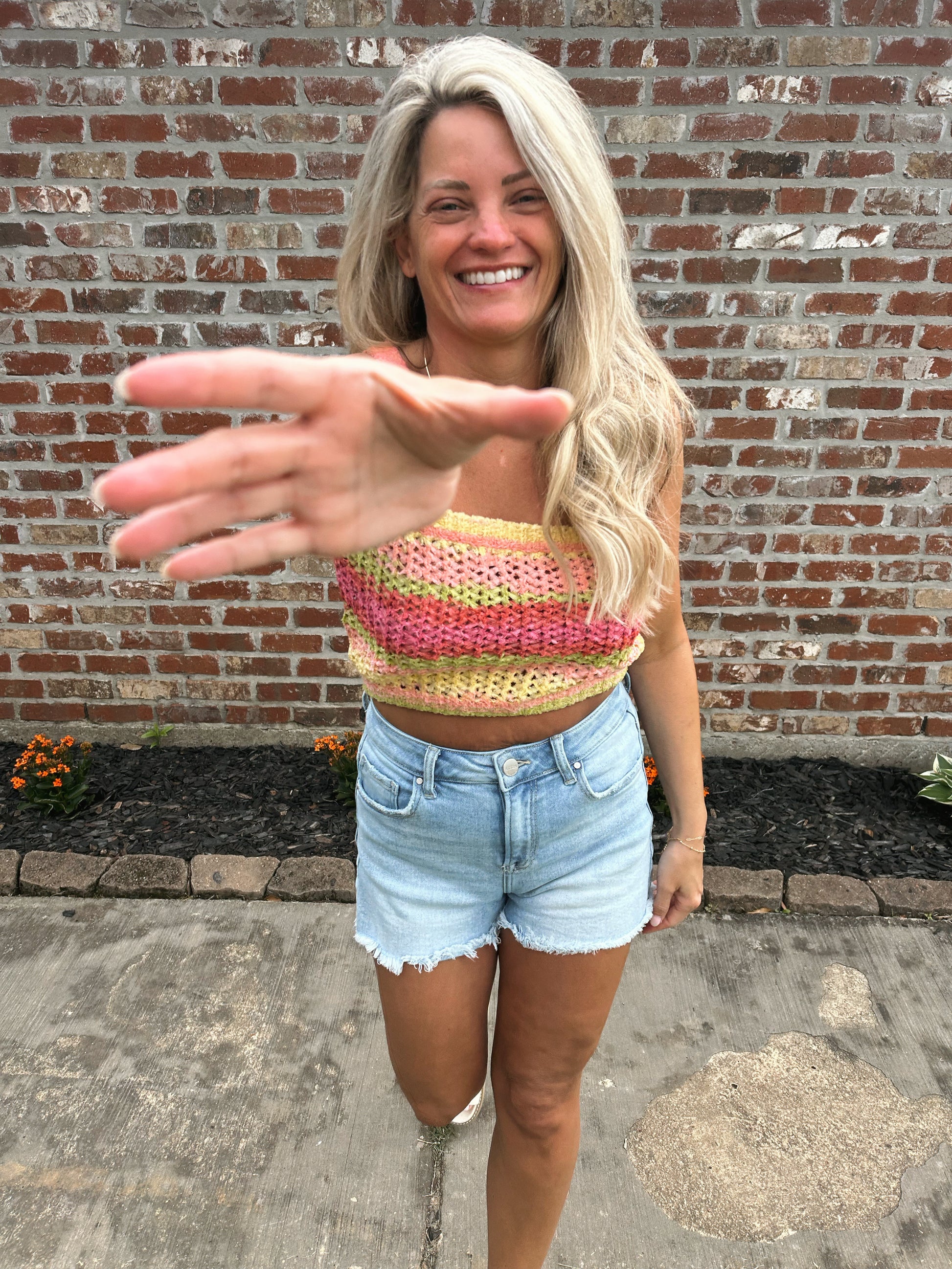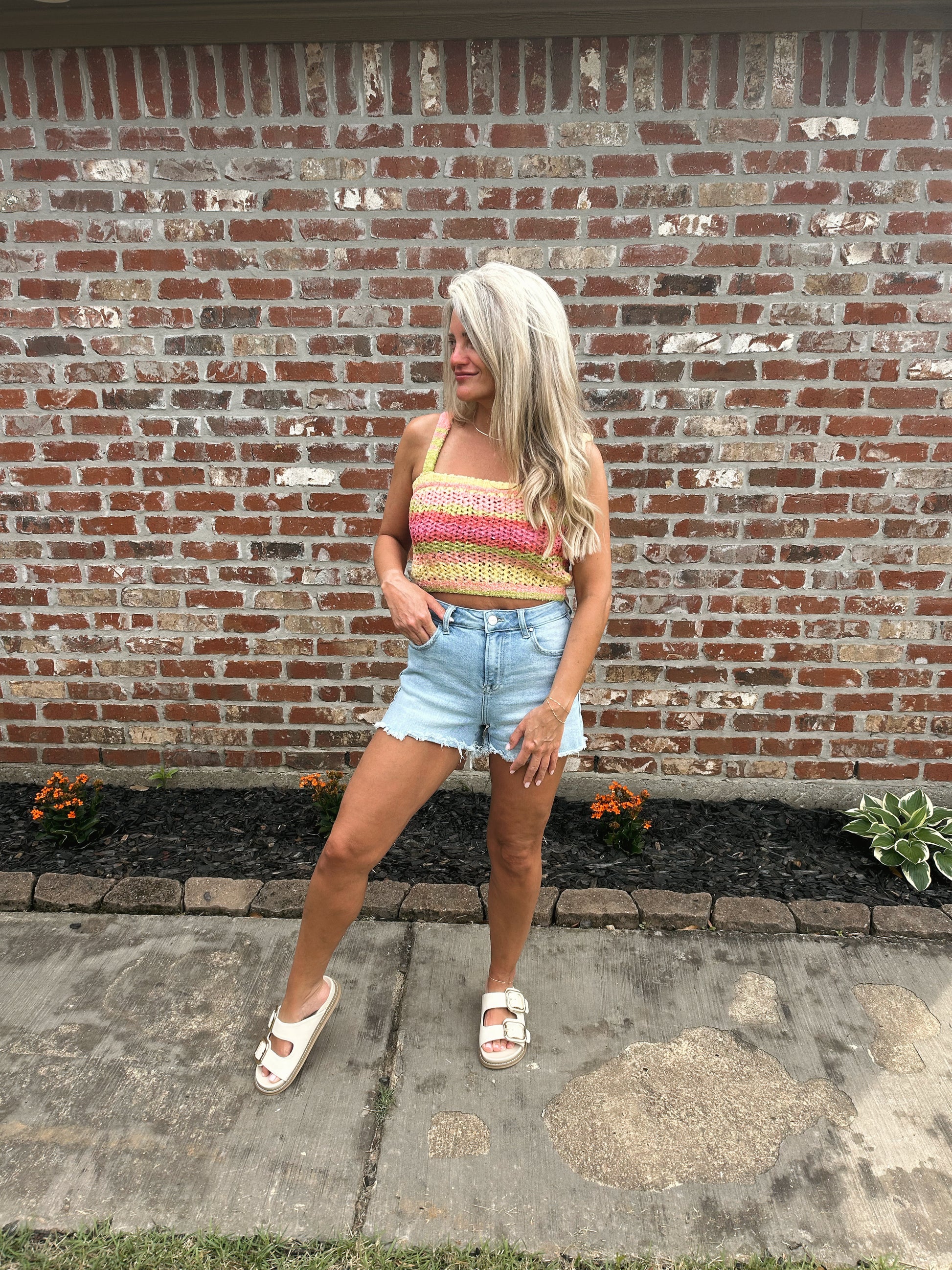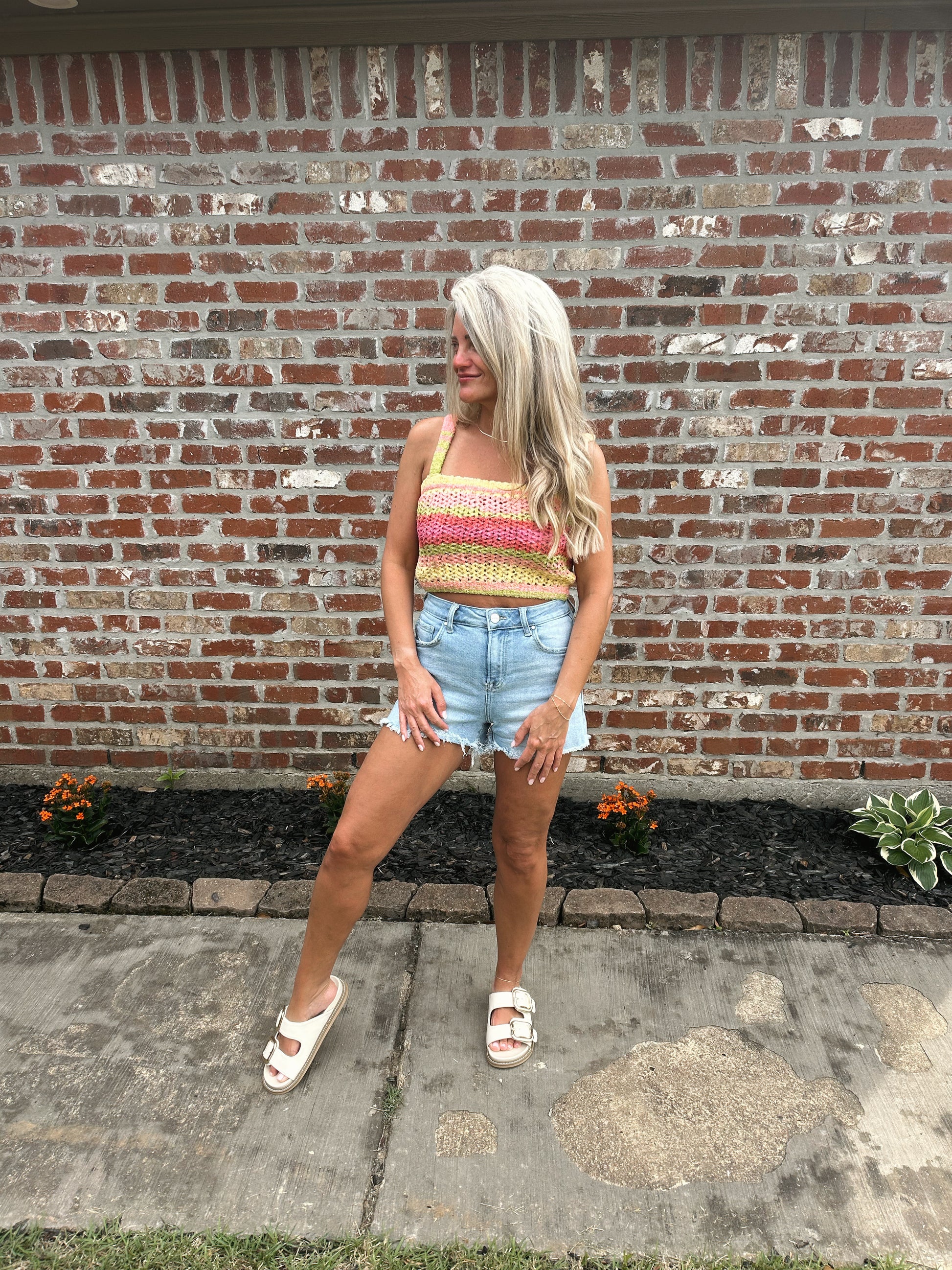 Brighten up your look with the Rainbow Crochet Sweater Tank Top. This sleeveless knit is all about playful charm, featuring a vibrant mix of colors in a handcrafted crochet design. The sweater-style fabric adds texture and a cozy touch while keeping things light enough for warm-weather wear. Perfect for layering over a bralette or pairing with denim for that effortlessly cool, boho vibe.