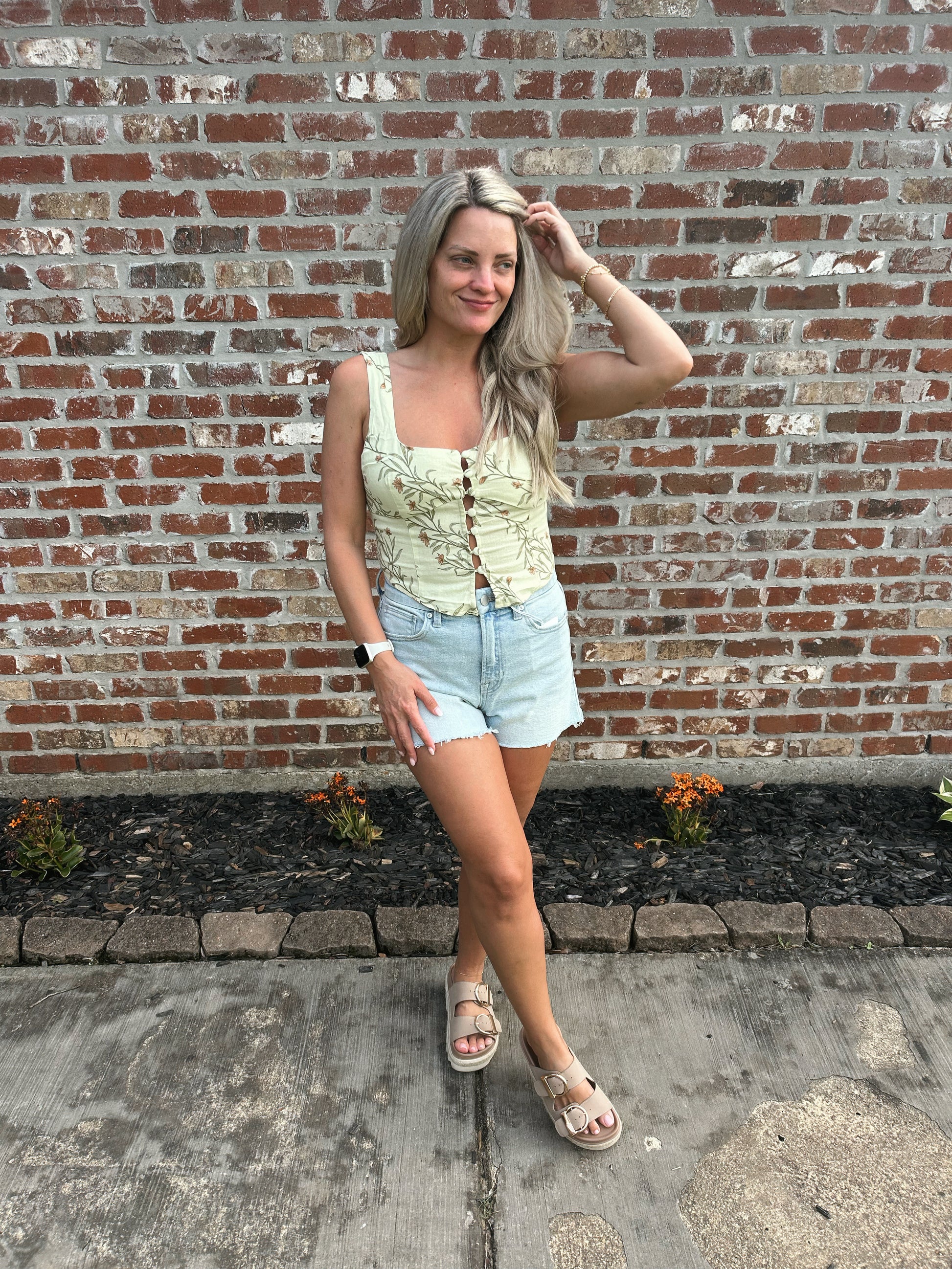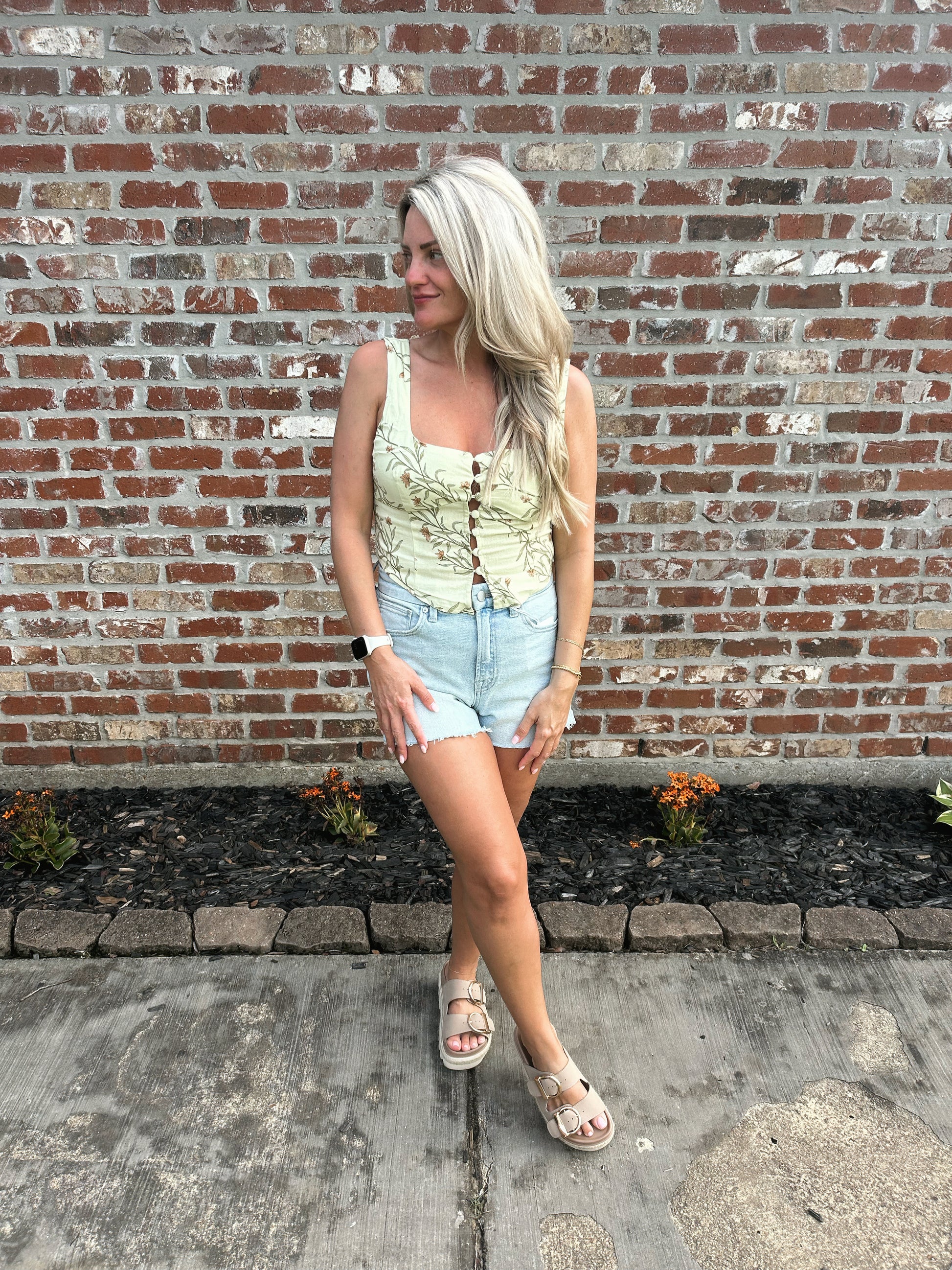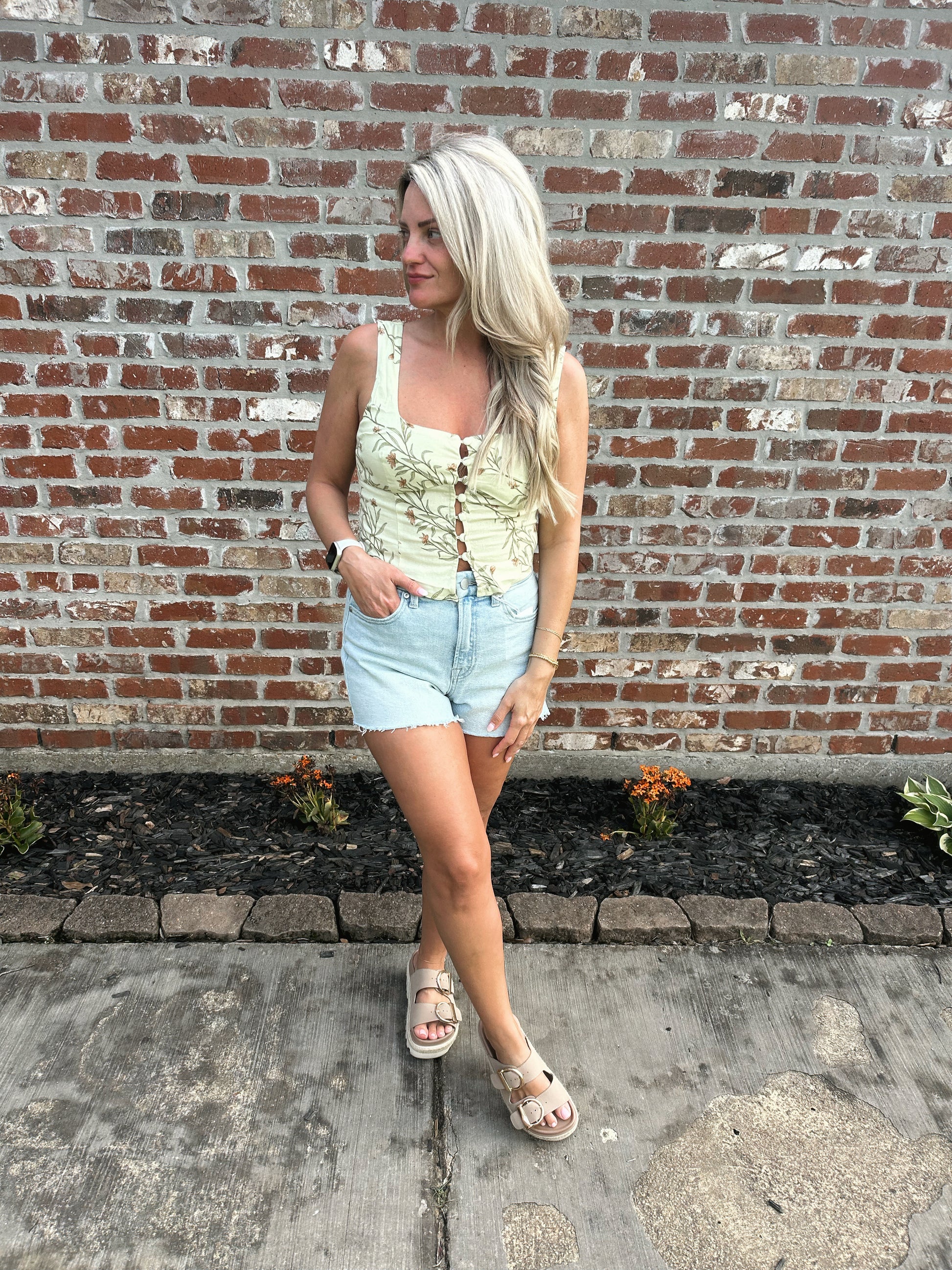 Floral design and smacked back making it have some stretch. Functional buttons. If in between sizes- size up