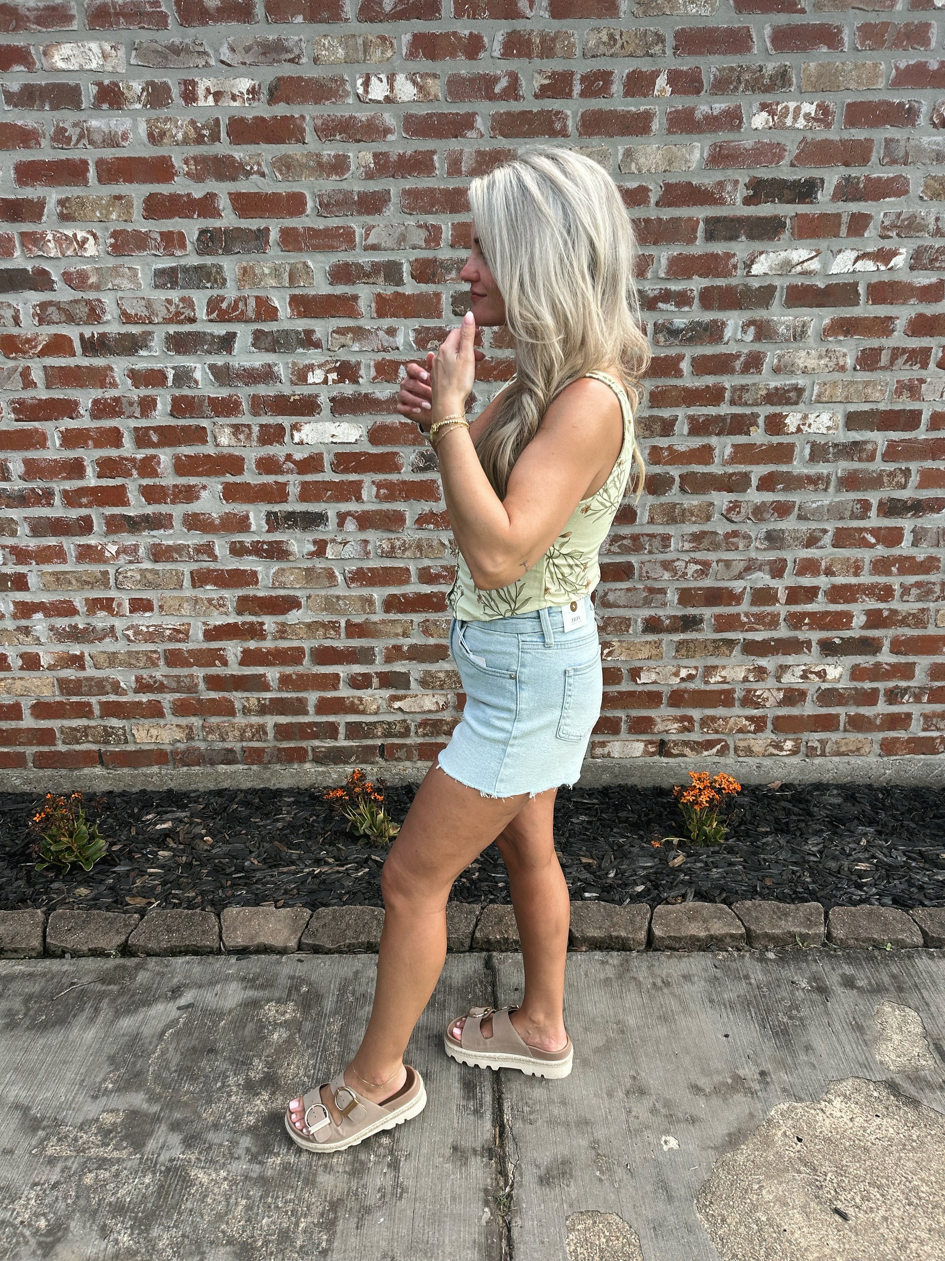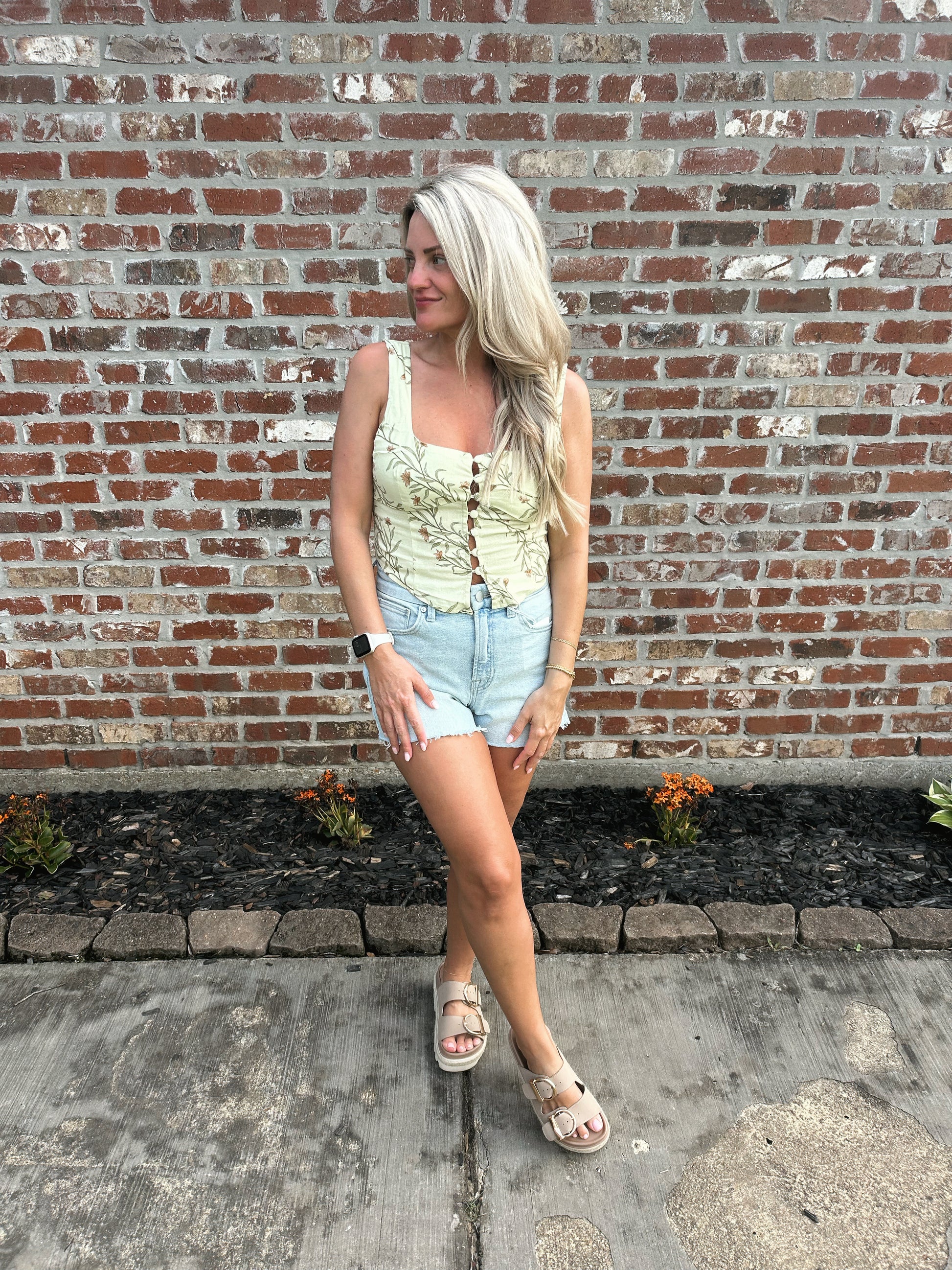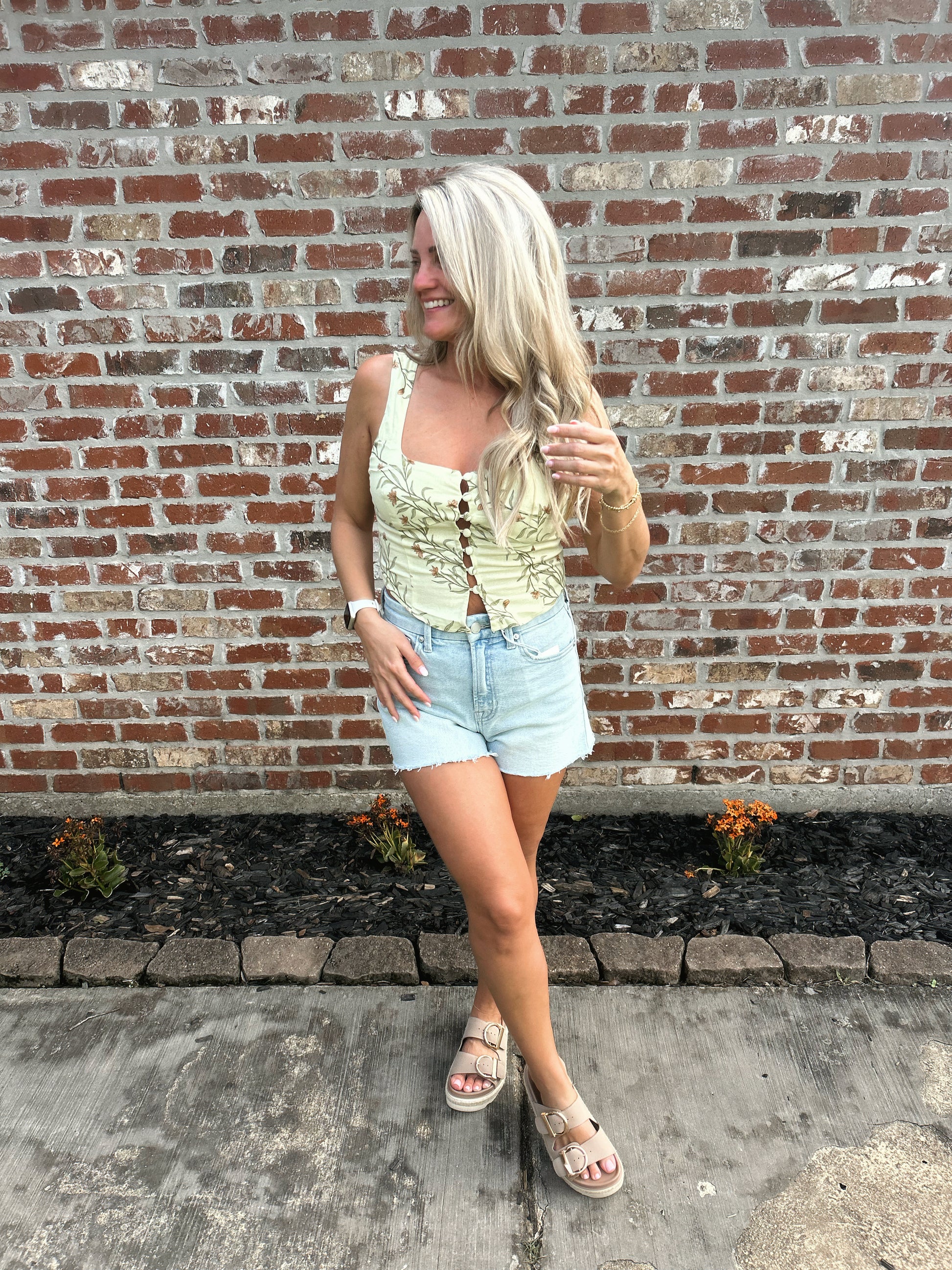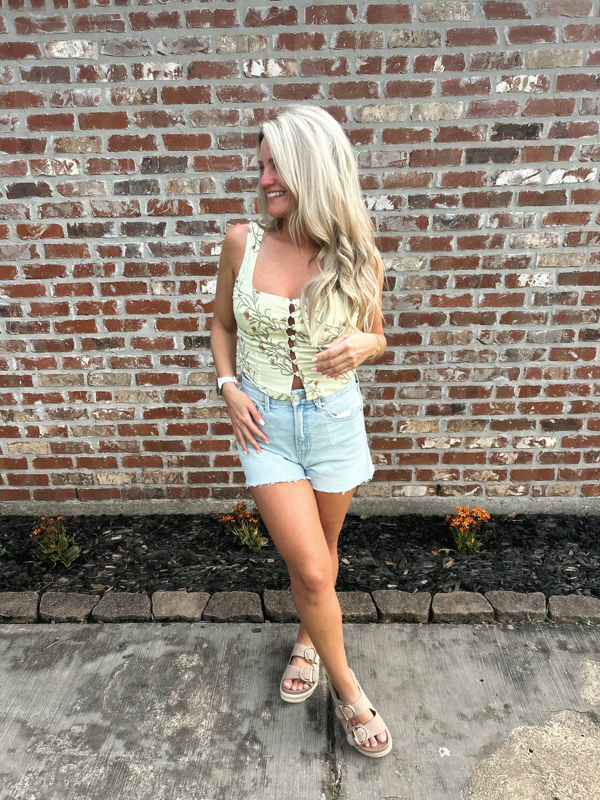 Floral design and smacked back making it have some stretch. Functional buttons. If in between sizes- size up