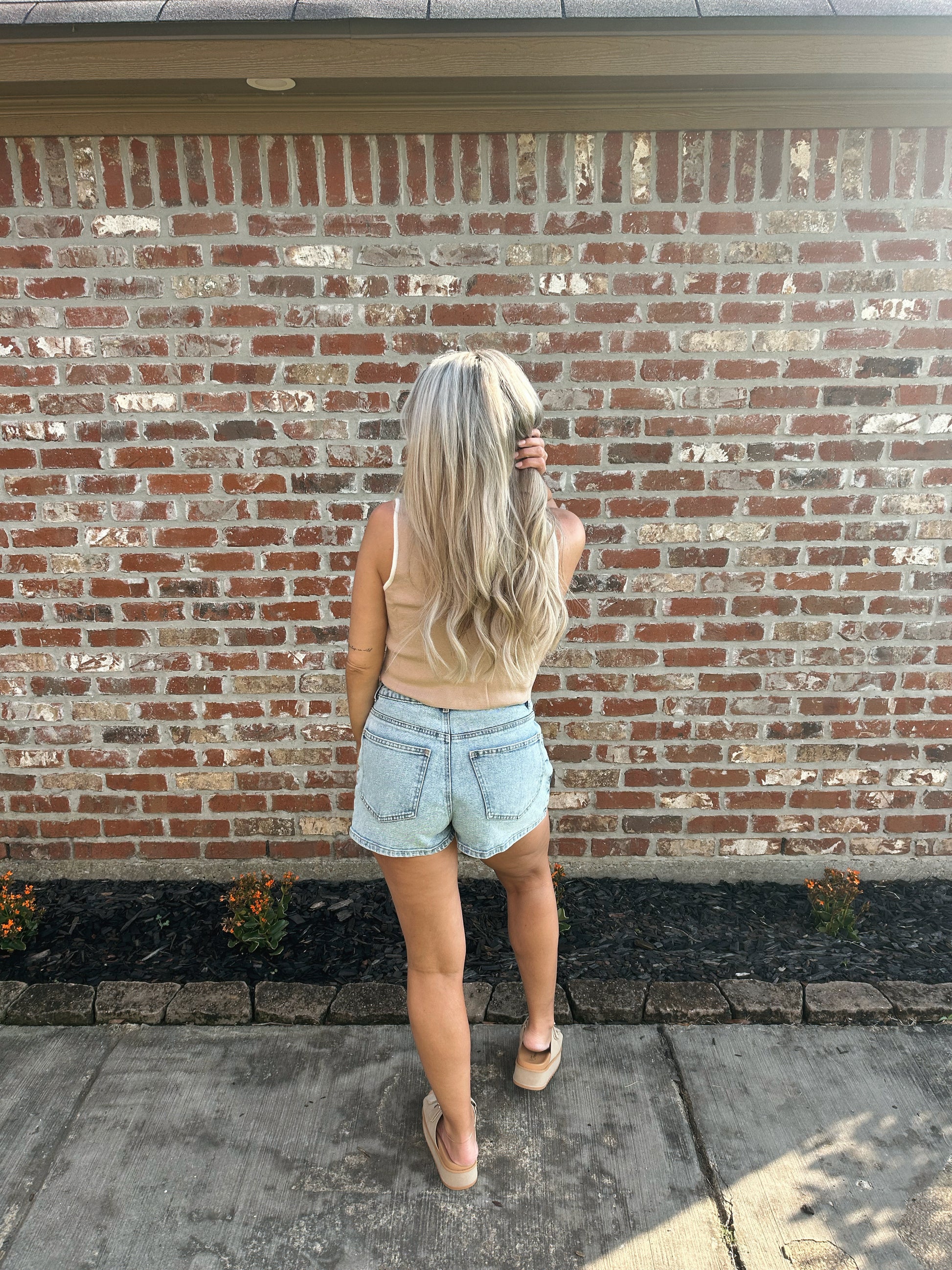 This mid rise denim skort is so cute and fun! Skirt look in the front and full shorts in the back.