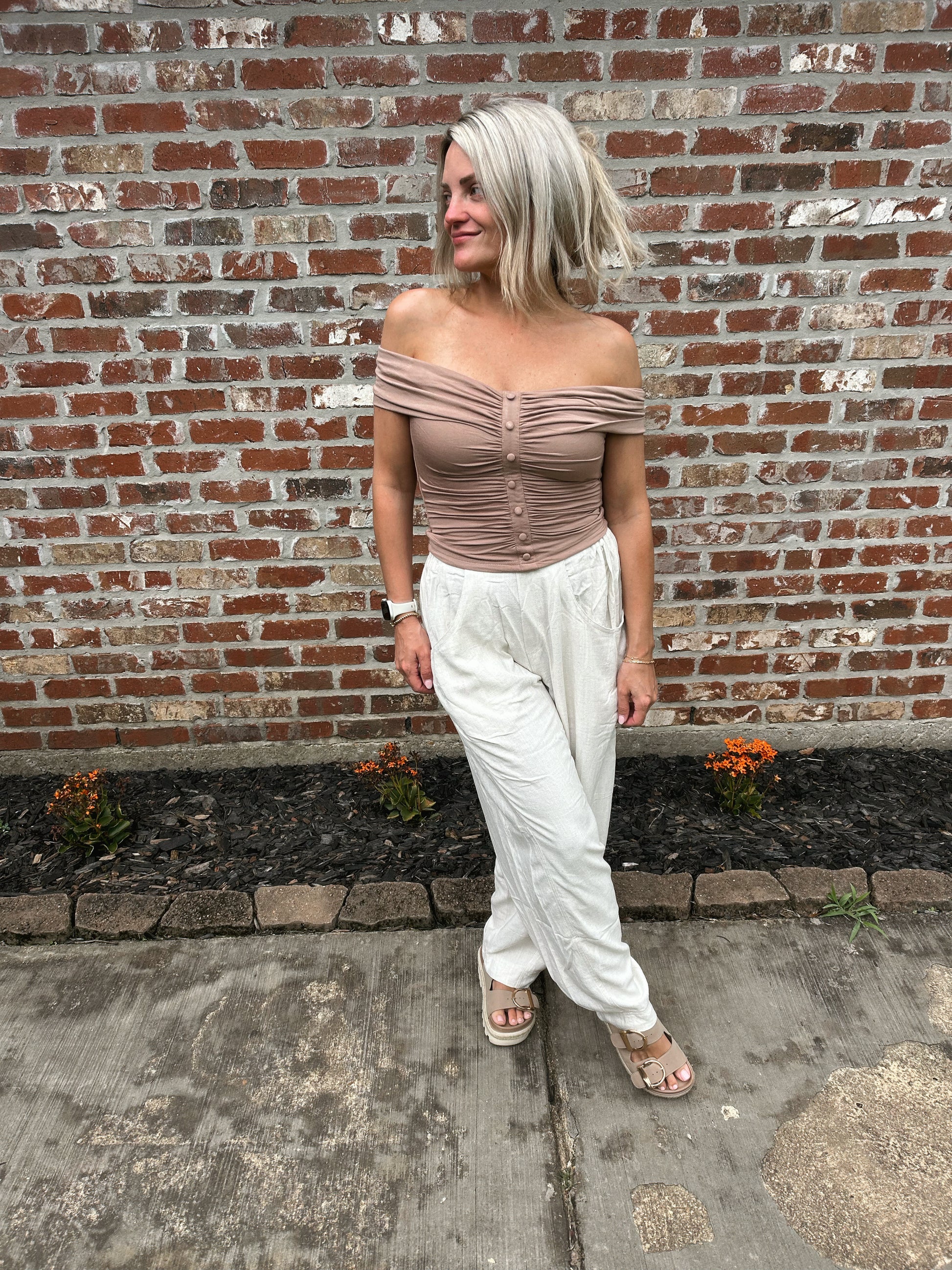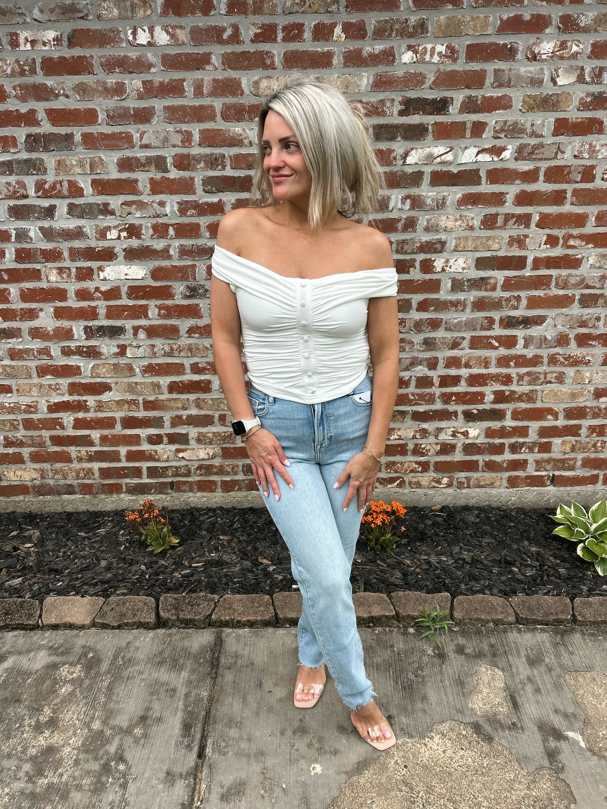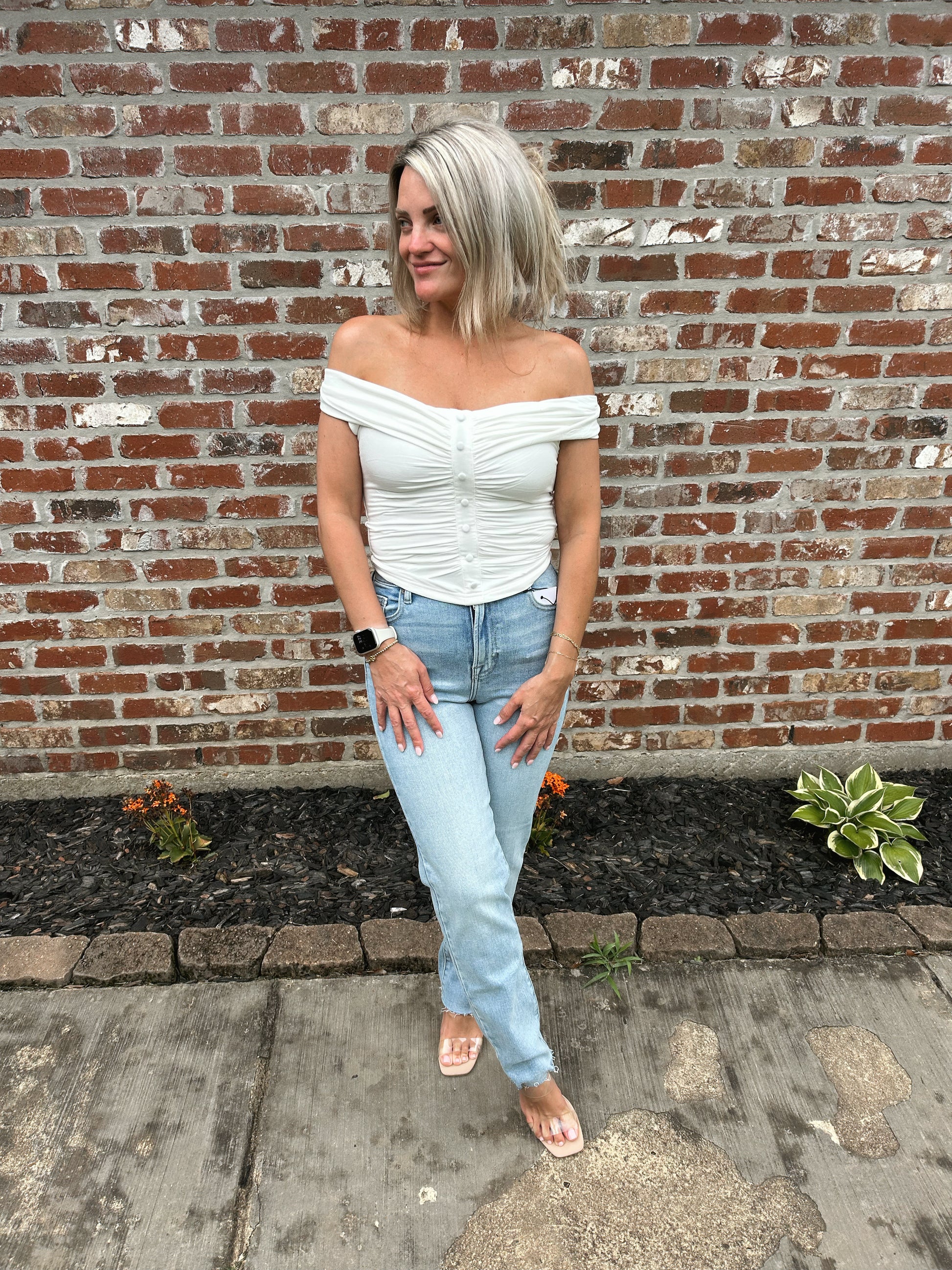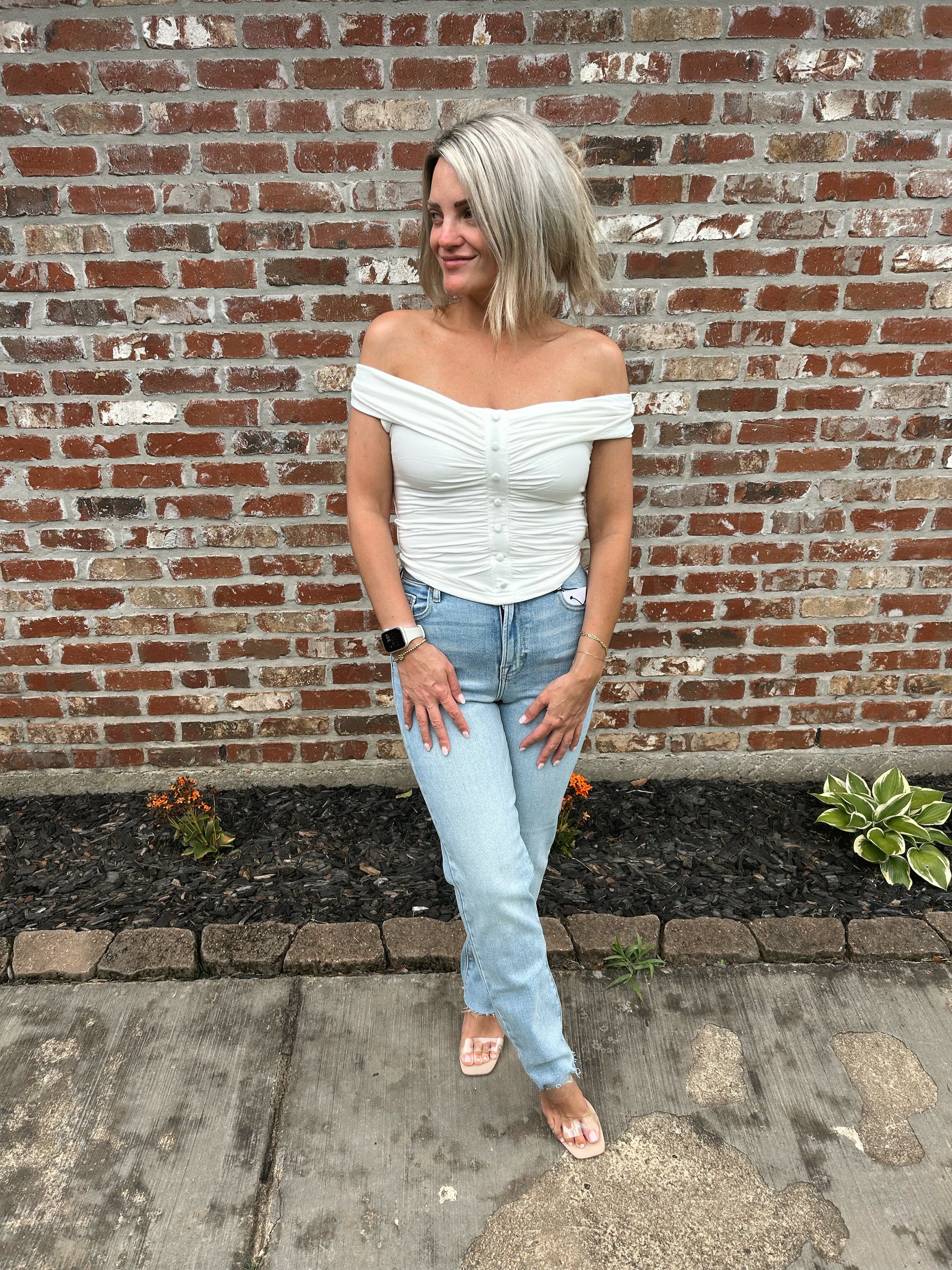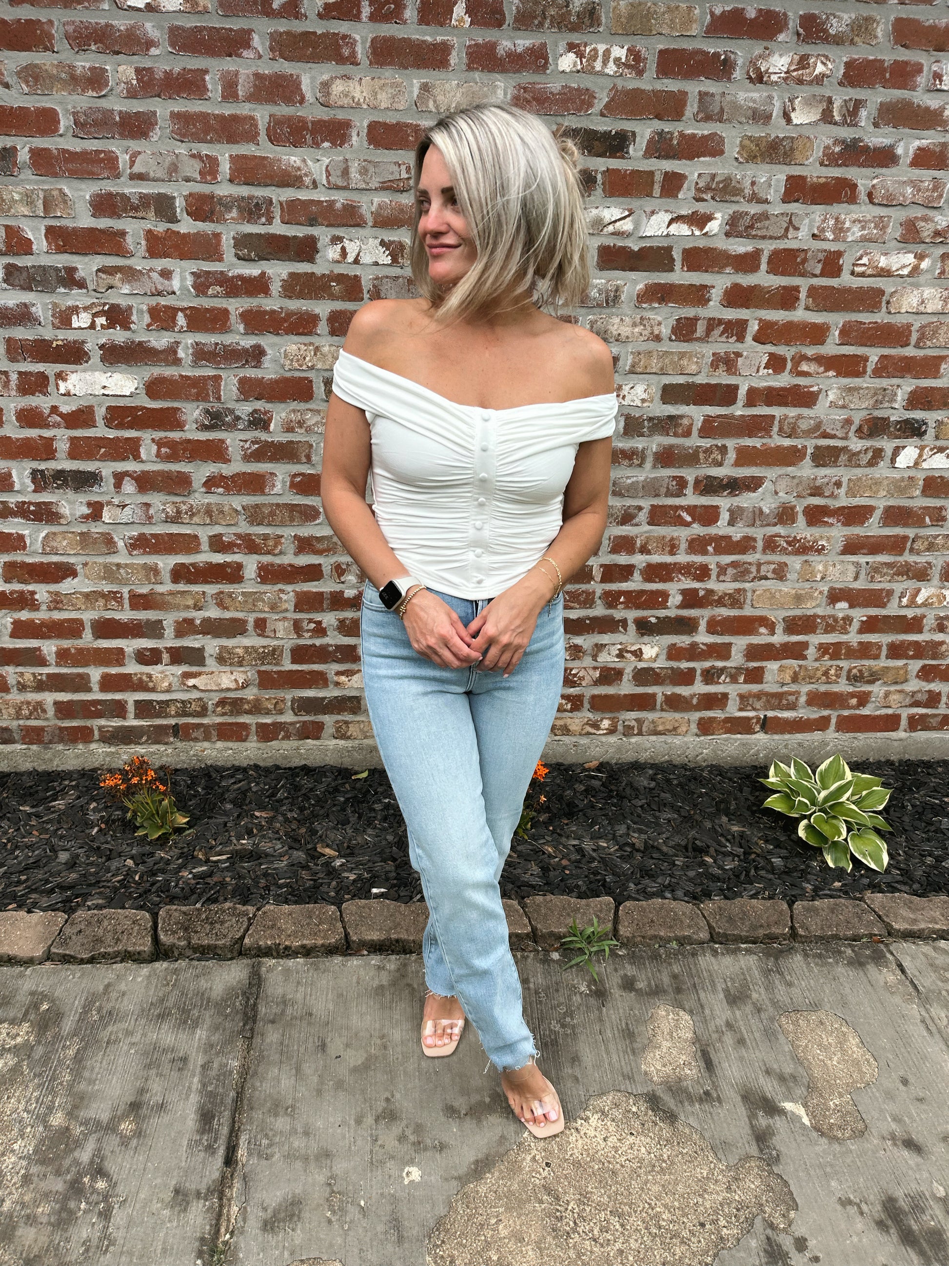 Stretchy, body hugging, off the shoulder button top. Buttons are not functional.