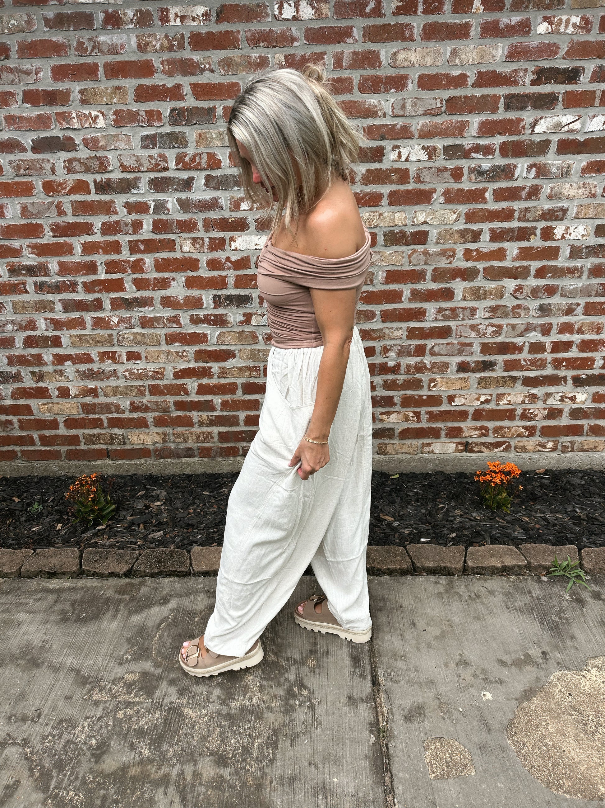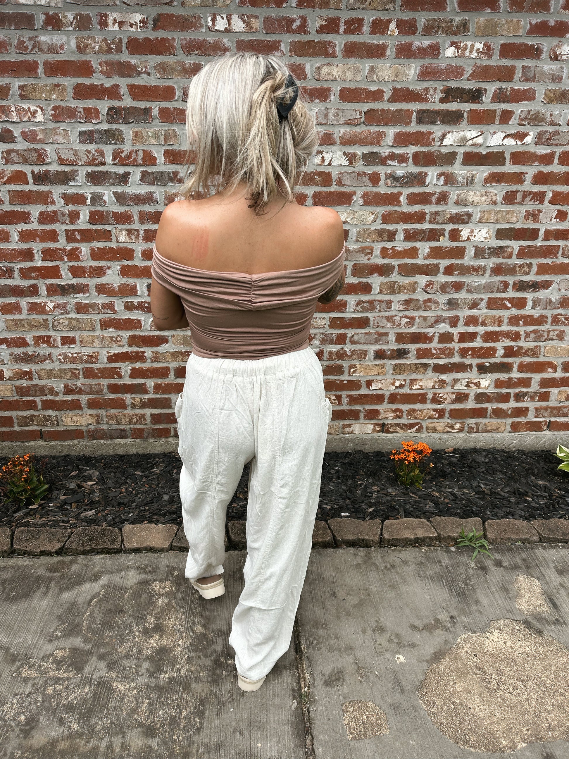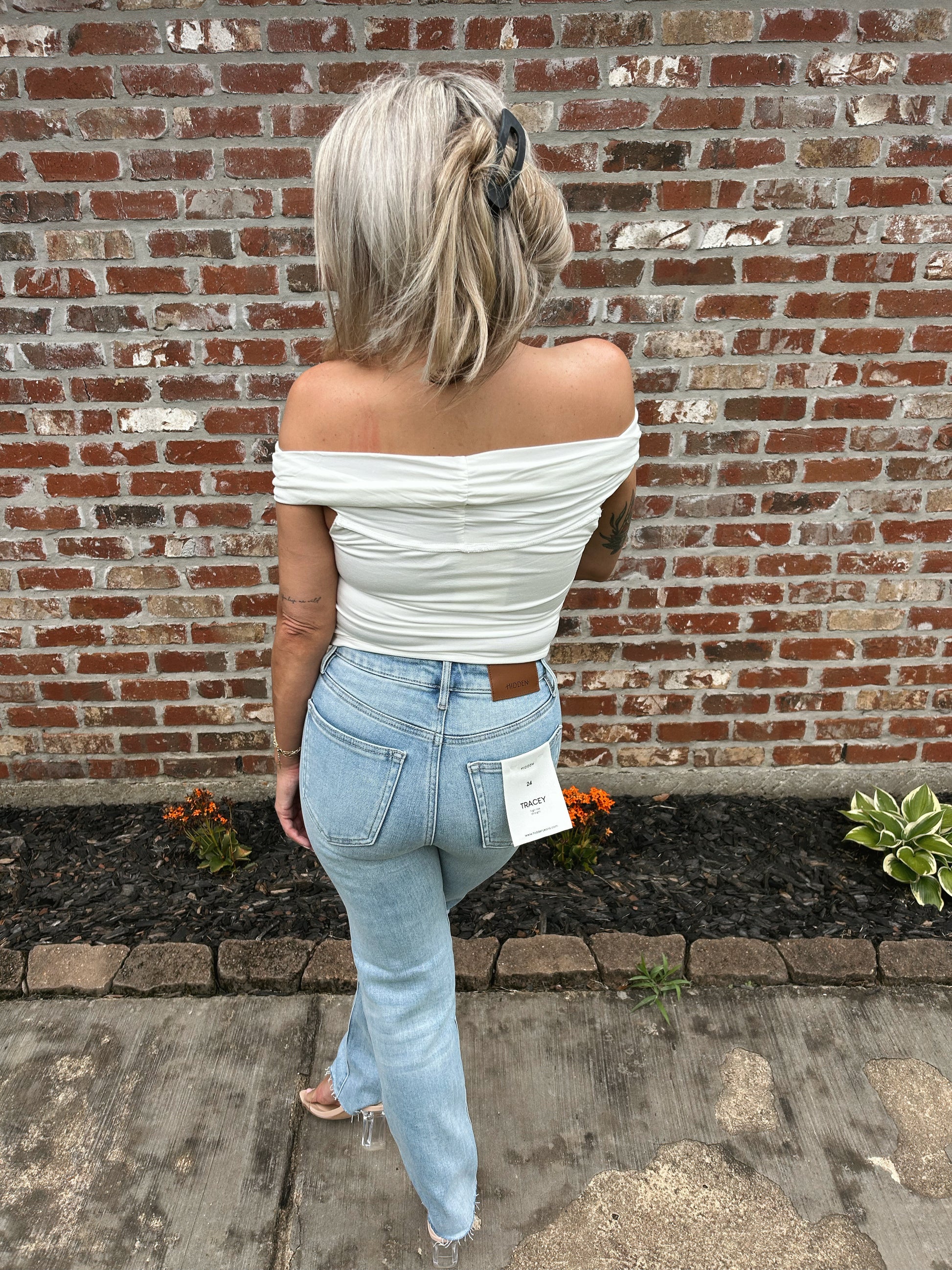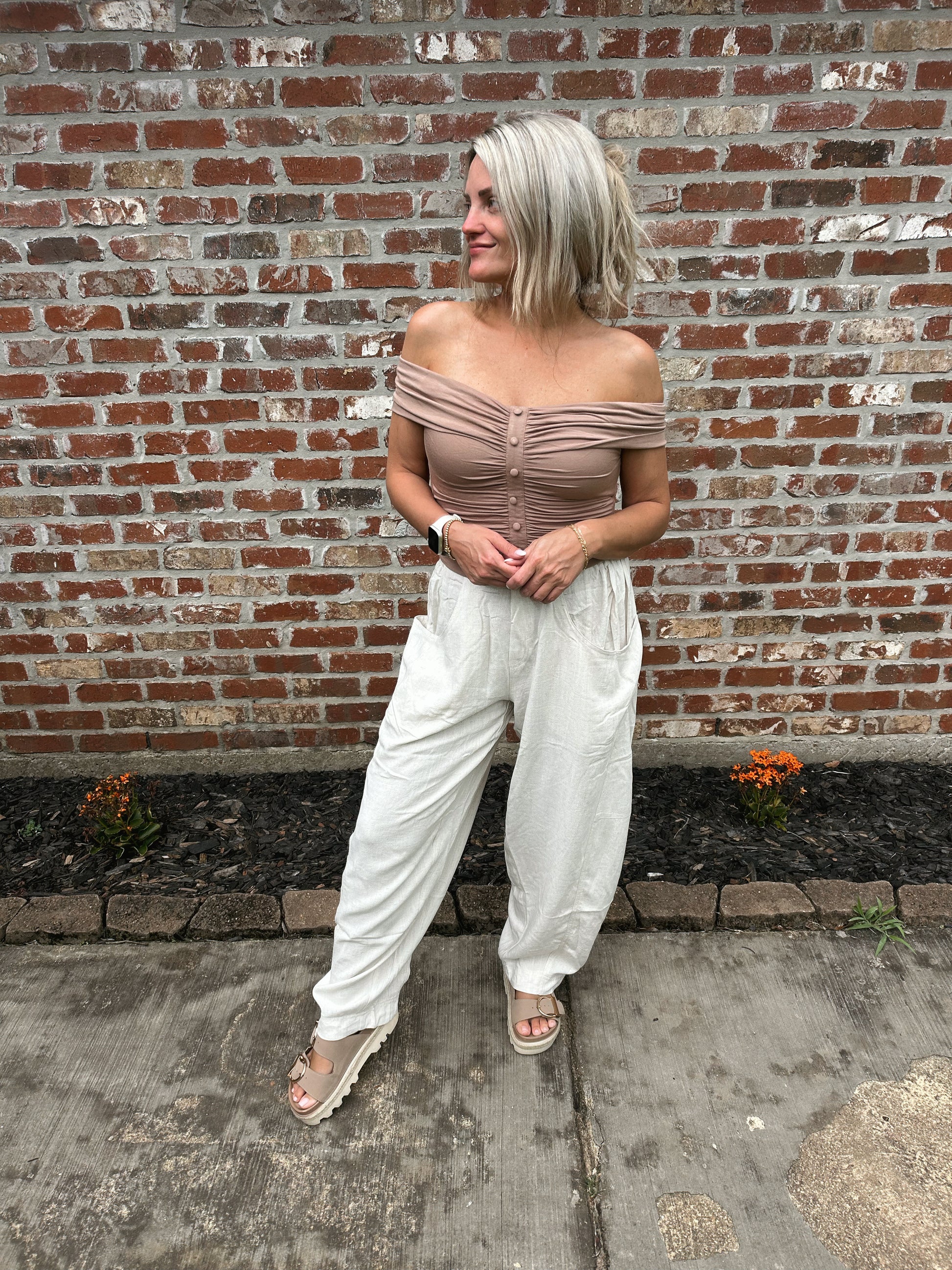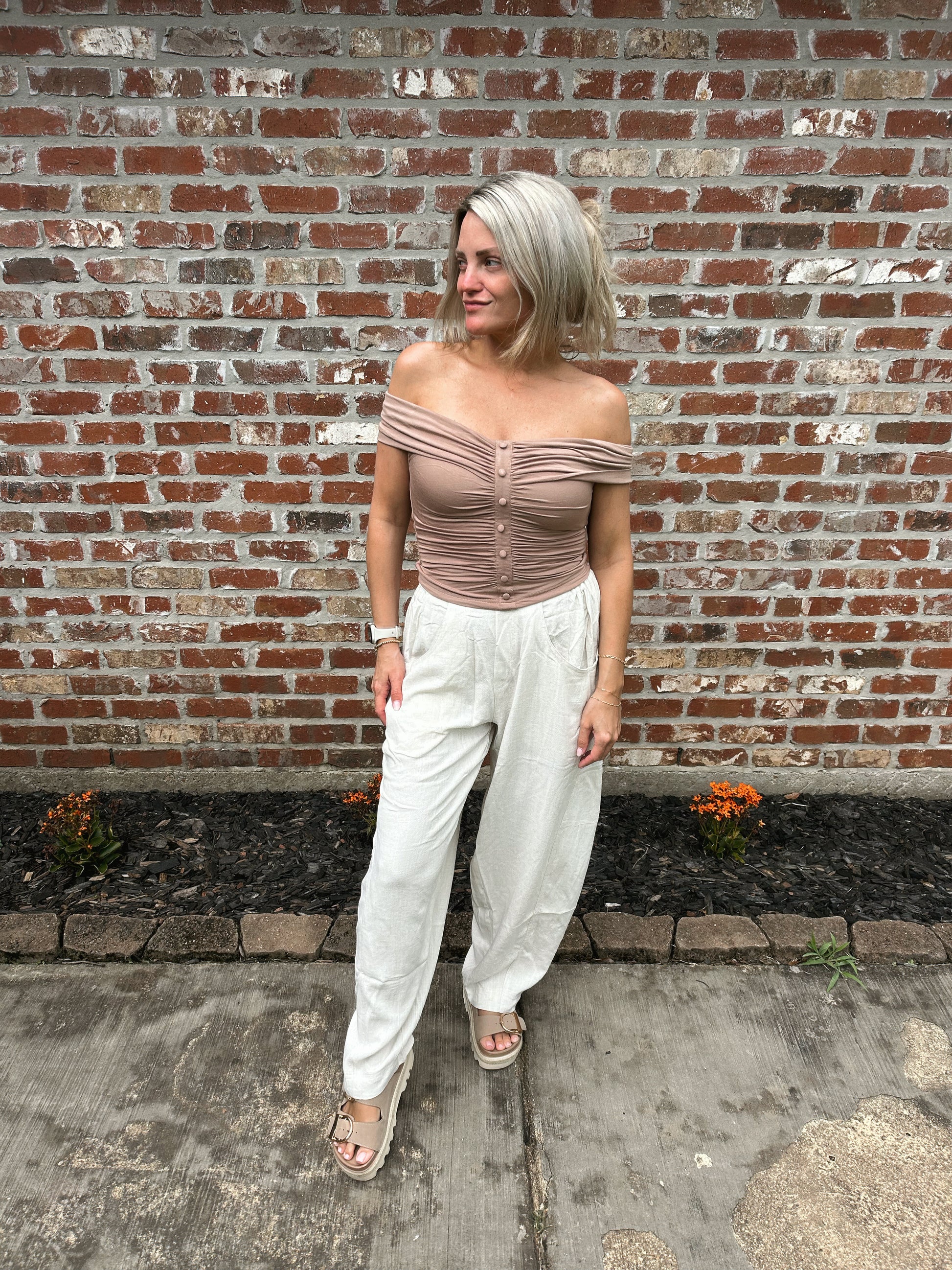 Stretchy, body hugging, off the shoulder button top. Buttons are not functional.